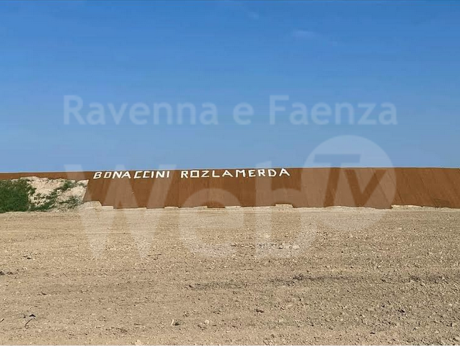 “Bonaccini rozlamerda” è l’insulto apparso lungo l’argine ripristinato del fiume Savio a Castiglione di Cervia. L’immagine è stata diffusa sui social network. Il presidente della Regione, dopo l’alluvione, viene quindi paragonato allo scarabeo stercorario, un insulto in romagnolo che ha portato il sindaco di Cervia Massimo Medri a condannare il gesto. Proprio nel weekend Bonaccini è stato in visita a Cervia per un sopralluogo alle saline duramente colpite dalla piena del fiume. Il primo cittadino di Cervia ha dichiarato: “Nel manifestare piena solidarietà e riconoscenza e stima al Presidente Bonaccini, ci auguriamo che le indagini possano risalire prontamente ai responsabili”.