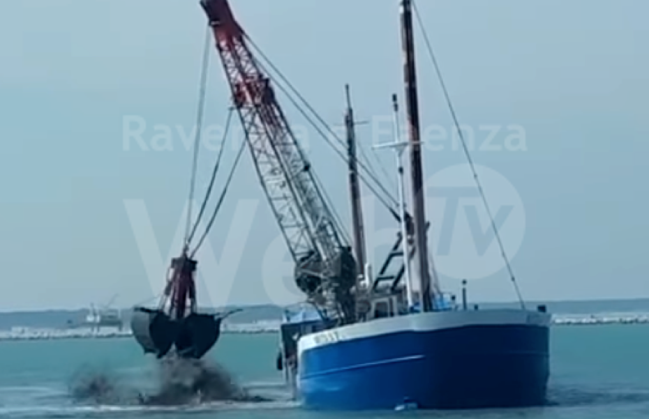 - e per la draga da cui si mostra lo sversamento di materiale torbido nell’avamporto di Ravenna.