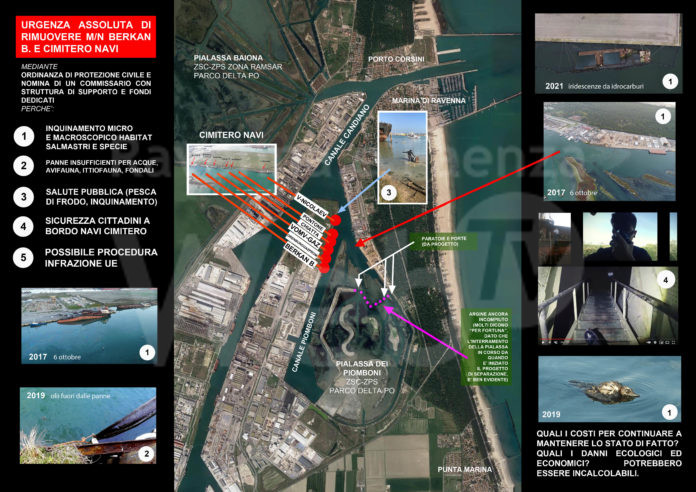 Posto che il T.A.R. si pronuncerà solo nei prossimi mesi, e che ancora non abbiamo letto i verbali delle conferenze di servizio in cui sarebbero state modificate le condizioni del bando, riteniamo però evidente che, alla luce del fatti – ovvero che da tre anni e mezzo un relitto non bonificato giace spezzato e poi affondato in un canale del Porto di Ravenna – la situazione sia del tutto fuori controllo. Nonostante, val la pena ricordarlo, a Ravenna siano disponibili eccellenze imprenditoriali di livello mondiale che a nostro parere potrebbero risolvere ad occhi chiusi la vicenda. Resta quindi più che mai urgente, lo ribadiamo, al fine di una risoluzione positiva di questa scandalosa ed inaccettabile vicenda, l’emanazione di una Ordinanza di protezione civile e la nomina di un commissario ad acta il quale, con competenza e fondi adeguati, possa rimettere ordine e finalmente liberare il Porto di Ravenna e la Pialassa Piomboni da questa immonda e gigantesca “discarica abusiva” di rifiuti tossici e pericolosi. Questi gli aspetti principali di criticità che perdurano da anni e che vanno sanati al più presto: