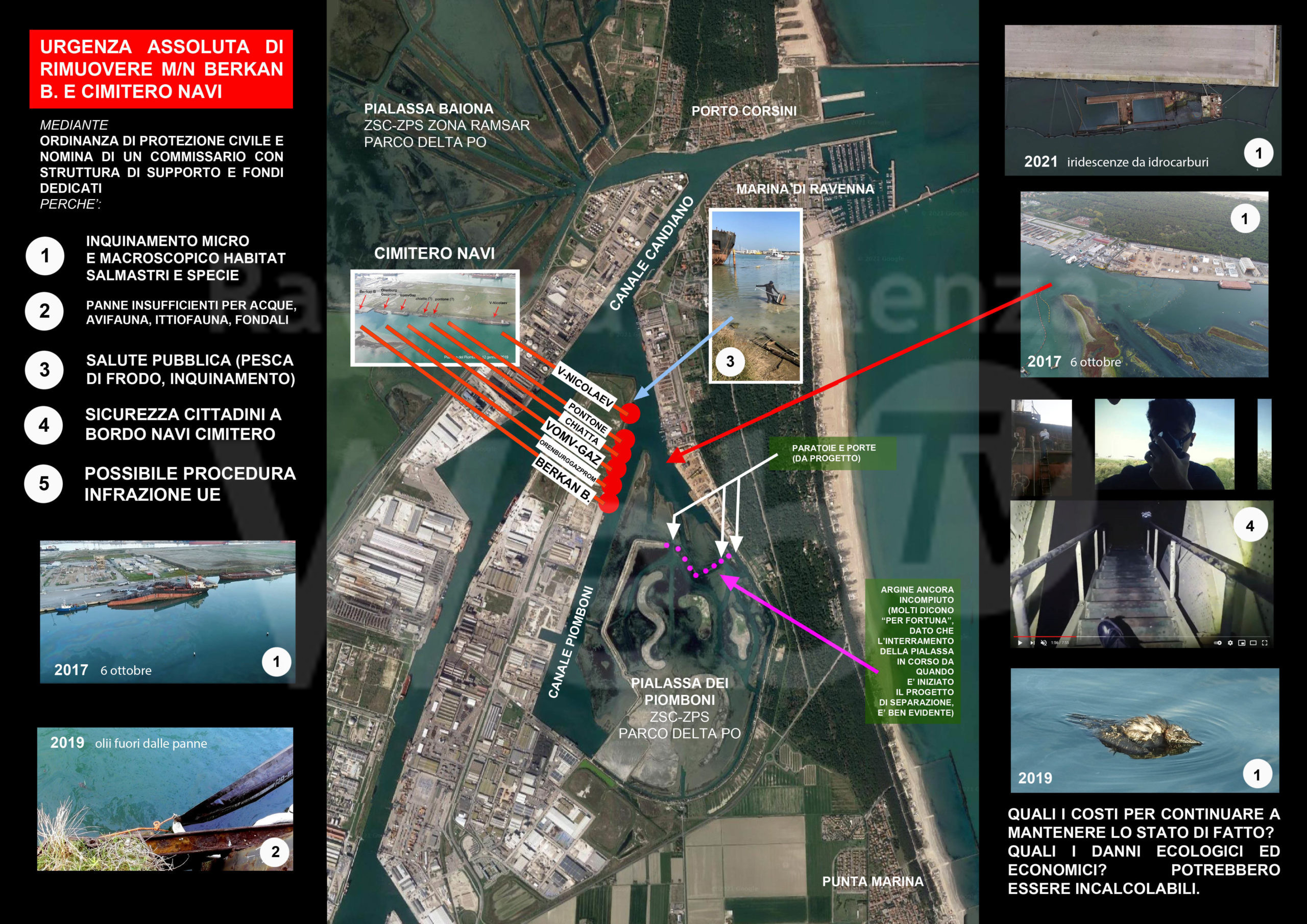 3) I rischi altissimi per la salute umana, rappresentati anche dalla raccolta abusiva organizzata, a fini commerciali, di molluschi nei pressi della Berkan B e delle carcasse arrugginite del cimitero delle navi; senza contare tutto il pescato dei capanni della Pialassa Piomboni e dei pescatori regolarmente autorizzati. Com’è noto, pesci e molluschi rappresentano bioaccumulatori naturali di metalli pesanti e di idrocarburi che mettono a repentaglio la salute dei consumatori;