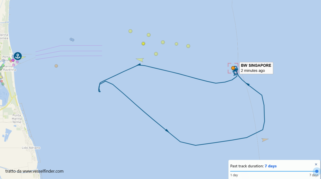 Consultando una app di tracciamento navi (VesselFinder), si nota che in una settimana la Singapore compie un “balletto” continuo, tra le 4 miglia e le 12 miglia, con tanto di giravolte ed altre manovre, inspiegabili ad un occhio profano come il nostro. Un gigante di quasi 300 metri di lunghezza, impegnato in evoluzioni continue? Giungono poi alcune segnalazioni, tutte da verificare, per cui la situazione sarebbe critica a causa delle condizioni inadeguate presso l’ormeggio, che farebbero temere per la sicurezza dell’unità stessa ad ogni variazione meteo nemmeno troppo severa. Cosa sta succedendo, dunque, per un progetto tanto decantato, autorizzato in tutta velocità e di cui si è garantita la massima sicurezza, nonostante svariate e ben motivate critiche, carte alla mano, quali quelle dell’ingegner Merendi e del Coordinamento ravennate Per il Clima Fuori dal Fossile? Forse le difese foranee del posto di ormeggio non sono idonee a garantire la sicurezza, e ogni volta che peggiorano le condizioni di mare o di vento la nave deve prendere il largo? I fondali sono sicuri? La nave è adeguata e può restare a Ravenna fino a che la famosa diga colossale non sarà realizzata? Quali i costi dei rimorchiatori impegnati durante gli spostamenti? Quale l’effettiva operatività in queste condizioni di moto perpetuo, e quali, soprattutto, le condizioni di sicurezza, sia per gli equipaggi che per l’ambiente marino e atmosferico? Senza pensare, ovviamente, a cosa succederà al nostro mare quando l’unità entrerà in funzione. Pare persino, ma su questo poniamo tutti gli ovvi dubbi del caso, che il comandante della Singapore abbia manifestato il proprio disagio.