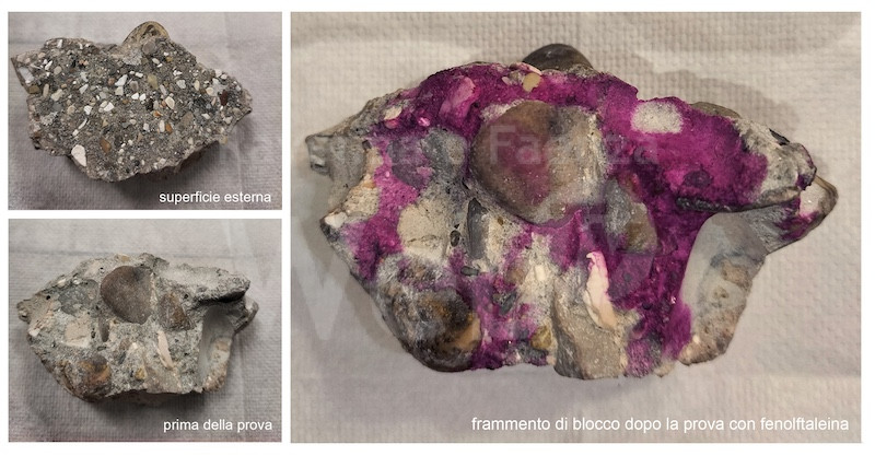 Un frammento della torre Hamon in demolizione è stato sottoposto a prova con fenolftaleina. Risulta che la carbonatazione del calcestruzzo è solo molto superficiale, quindi, nonostante l’età, il materiale appare ancora in condizioni eccellenti ed in grado di proteggere i ferri di armatura da fenomeni ossidativi.
