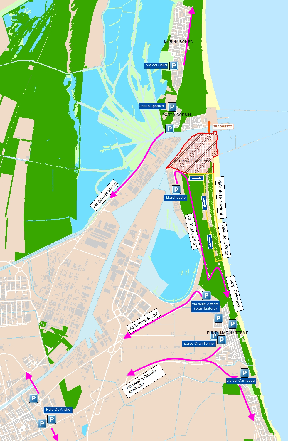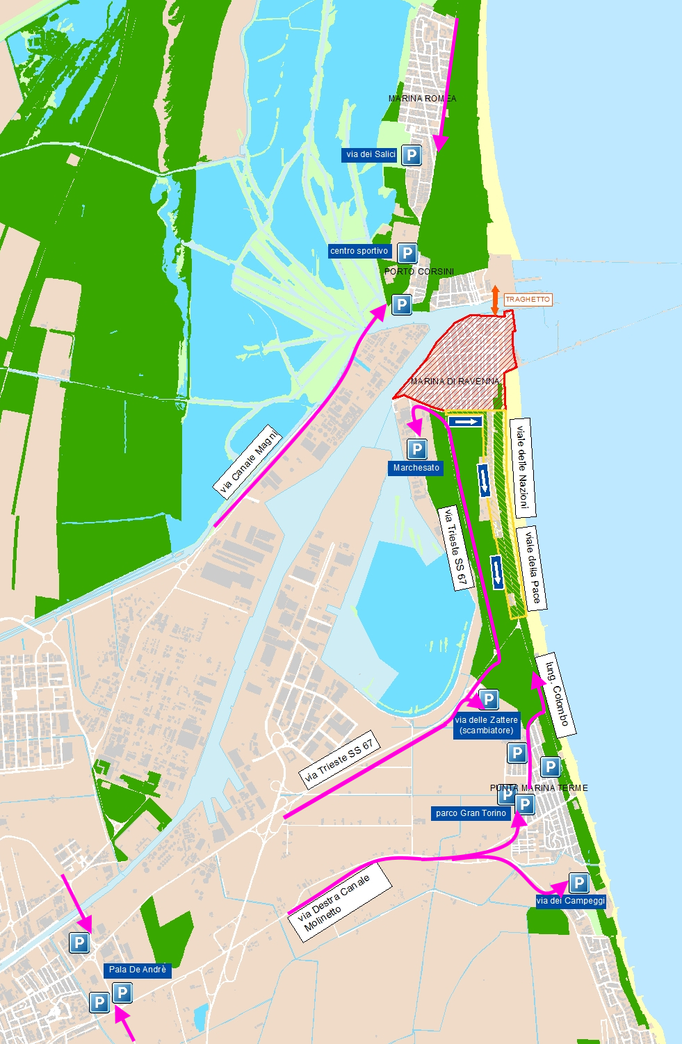 percorso alternativo: Statale Romea SS309, via Canale Magni fino a Porto Corsini, poi traghetto per Marina di Ravenna. Attenzione! Traghetto accessibile solo a pedoni e ciclisti dalle 7 di venerdì 8 luglio alle 7 di domenica 10 luglio, quindi se si sceglie questo percorso alternativo bisogna parcheggiare a Porto Corsini