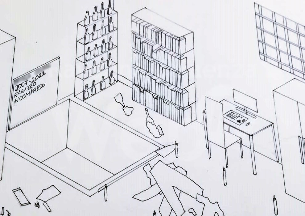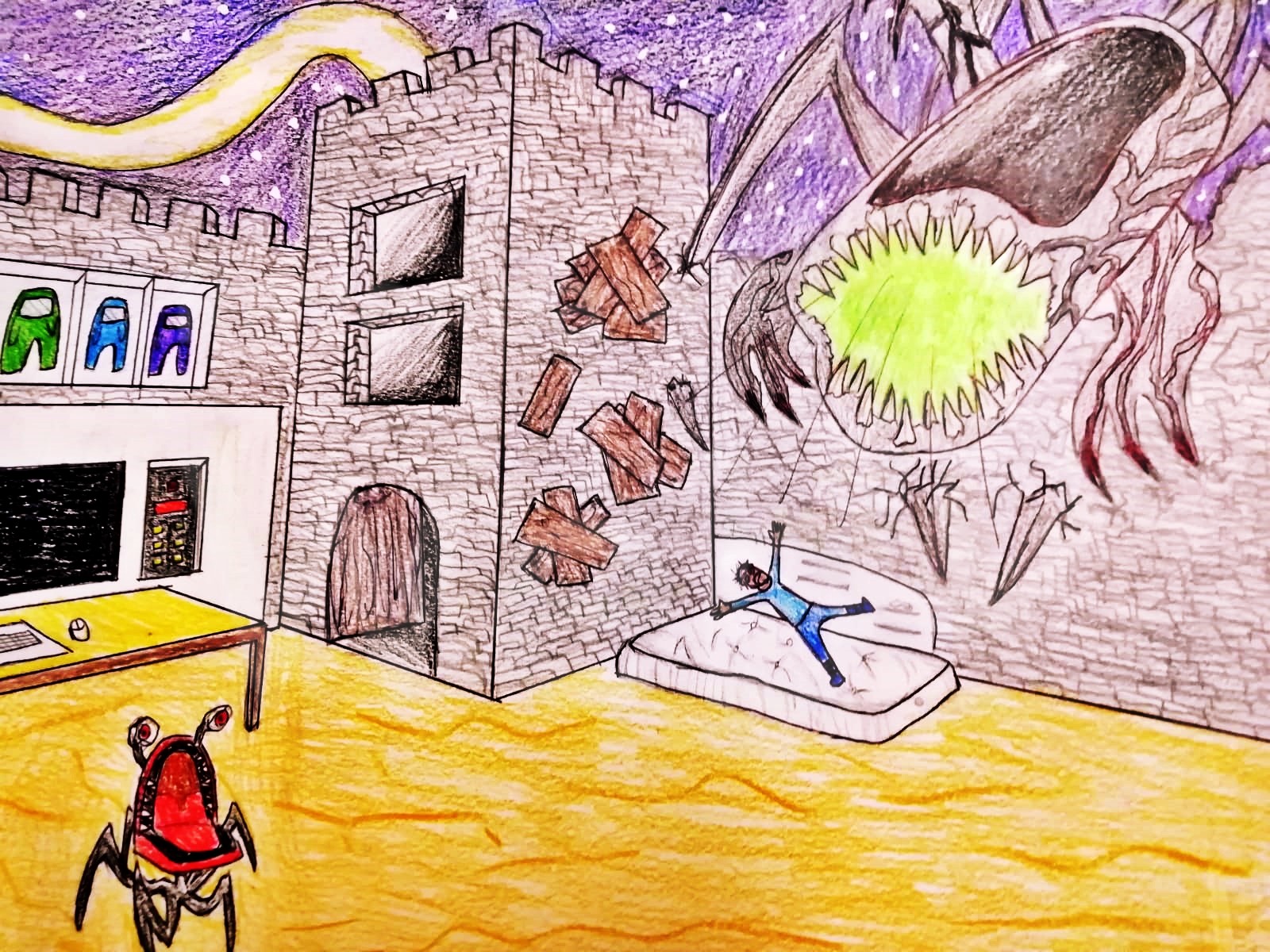 Pareti grigio scuro, solai ora spalancati su un cielo livido ma stellato ora totalmente neri, aracnidi voraci sul punto di afferrare un uomo disperato, riverso su un materasso con occhi atterriti e con braccia e gambe divaricate verso l’alto, una cameretta nella quale tra armadietti, una libreria e una scrivania con pc emerge a sorpresa una cavità ben squadrata e contornata, quasi fosse una piscina, nel cuore della stanza e del foglio: una cavità, preannunciata da candele accese tra vestiti dismessi, su cui si staglia una sorta di epigrafe con tanto di necrologio che recita lapidario ‘ragazzo incompreso’, accompagnato da nome e cognome, anno di nascita e presunta morte dell’autore dell’elaborato in concorso.