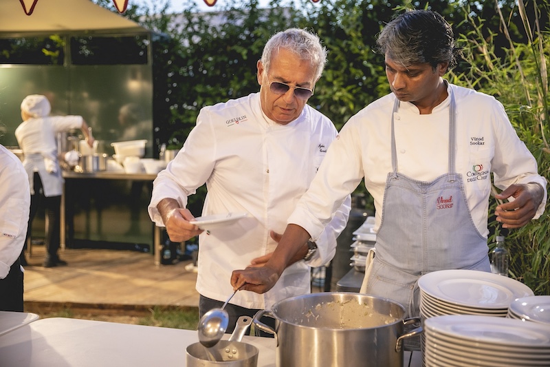 Anche quest’anno la squadra ai fornelli è d’eccezione e ha approntato un menù che non lascerà delusi i circa 150 prenotati alla cena. Si comincia con Marco Cahssai, executive chef del Ristorante Atman in Villa Rospigliosi, che proporrà un antipasto a base di lingua di vitello, scapece, alici di Cetara e frozen di beurre blanc. A proseguireil primo del pentastellato chef Igles Corelli: riso Goio Sant’Andrea, mugnoli, senape selvatica e olio al carbone. Il secondo sarà a cura di Antonella Ricci e Vinod Sookar, noti come i “Romeo e Giulietta della cucina italiana” e già nella “banda” dell’edizione 2022 della “Cena delle Stelle”: il duo proporrà cubo di Cappello del prete arrostito, salsa creola e canestrato morbido. Infine un doppio dessert: Corrado Parisi ingolosirà l’atmosfera con un piatto a base di limone nero e timut, per poi concludere con una mousse al cioccolato biondo, mango, macaron al cioccolato, cocco e lime. Ogni portata sarà accompagnata da un vino in abbinamento offerto da Terre Cevico, main partner dell’iniziativa.