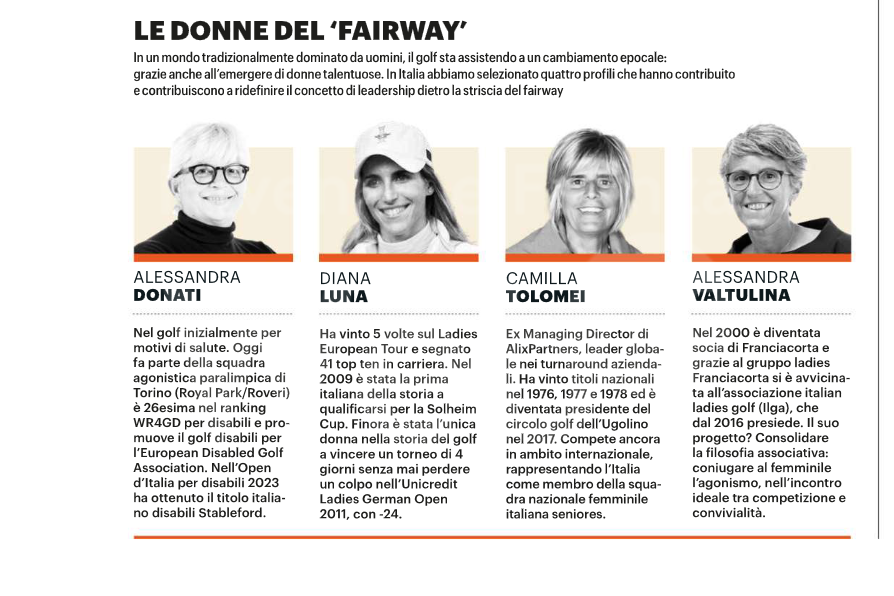 “In un mondo tradizionalmente dominato dagli uomini” si legge sul periodico “il golf sta assistendo ad un cambiamento epocale: grazie anche all’emergere di donne talentuose. In Italia abbiamo selezionato quattro profili che hanno contribuito e contribuiscono a ridefinire il concetto di leadership dietro la striscia del faiway”.