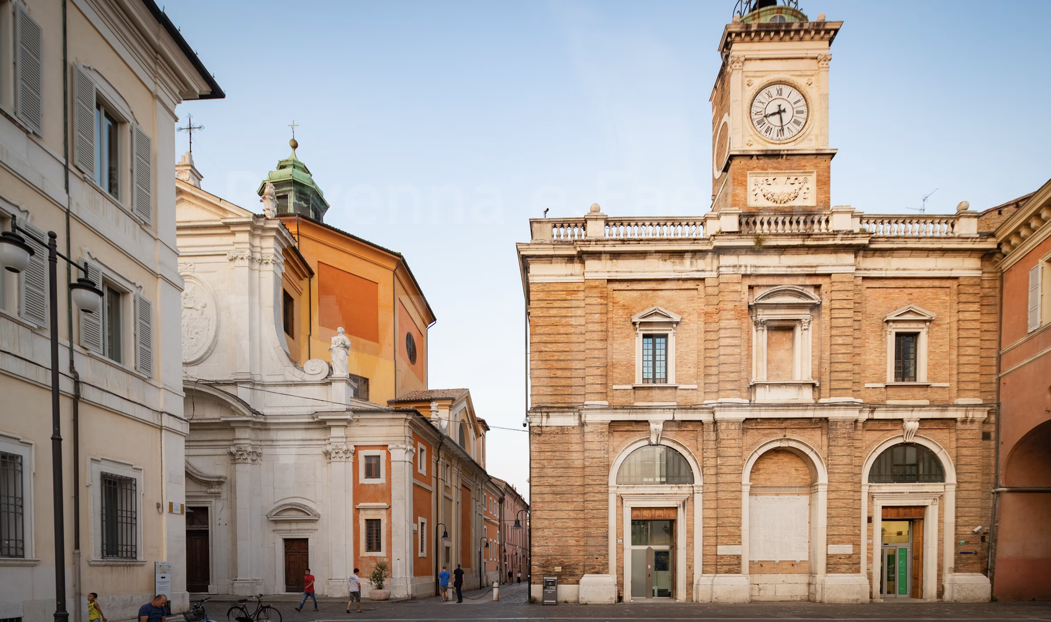 Costruito alla metà del XIII secolo, all’epoca in cui i Da Polenta avevano il controllo della città, il Palazzo dell’Orologio ha avuto nei secoli alterne vicende: fusione tra le due ex chiese di San Sebastiano e San Marco, venne riconvertito in edificio unico nel XV secolo e rimase destinato a sede religiosa fino alle soppressioni napoleoniche che lo trasformarono in sede della Dogana. Nel cuore naturale della città, immagine incantevole per chiunque arrivi in piazza del Popolo da San Vitale e via Cavour, il Palazzo deve la sua attuale facciata neoclassica all’intervento nel 1783 dell’architetto ravennate Camillo Morigia che ne disegnò la versione odierna, caratterizzata dalle finestre a timpano, le lesene e le tre ambie fornici del piano terra, un’immagine simbolo della città e della sua storia.