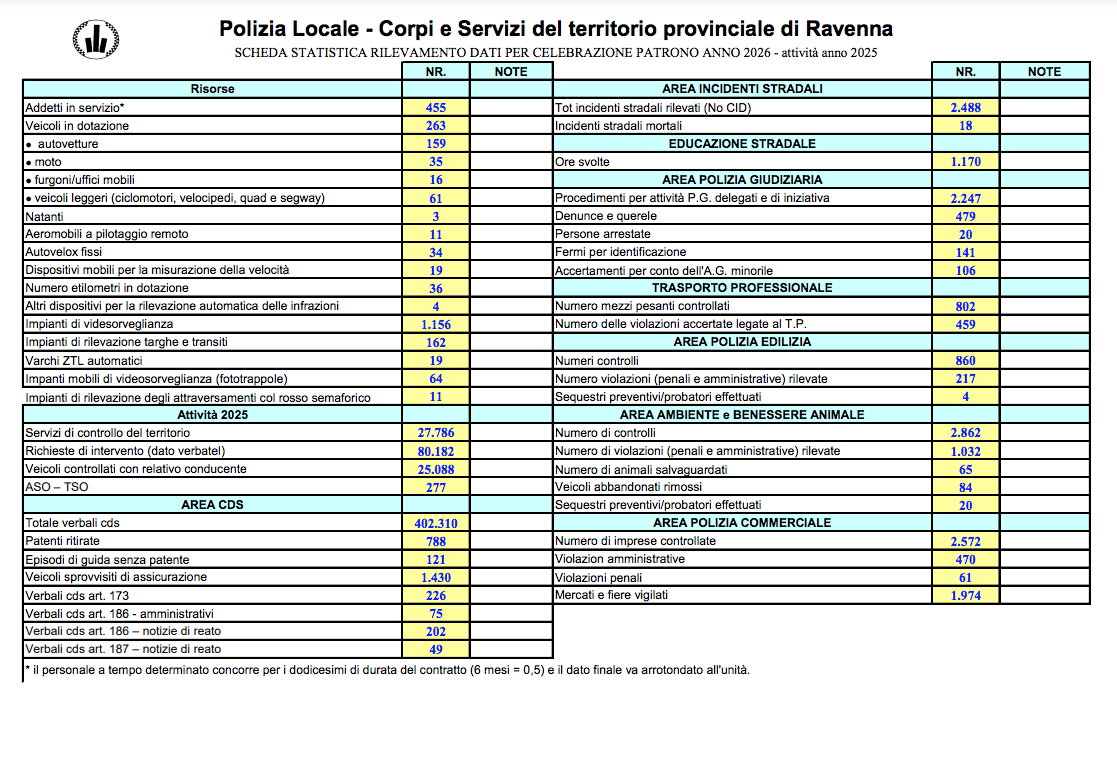 In occasione del patrono San Sebastiano, le Polizie Locali della provincia di Ravenna presentano i dati relativi alle attività del 2025. In tutta la provincia di Ravenna sono stati 80.182 le richieste di intervento arrivate alle centrali operative. A queste si aggiungono i servizi organizzati dai vari comandi. La Polizia Locale si dedica in particolare alla sicurezza stradale, al controllo delle normative edili, al rispetto dell’ambiente e del benessere animale, alle violazioni in ambito commerciale e al contrasto all’abusivismo. Rientrano nei compiti della polizia locale anche gli accertamenti sanitari obbligatori, un fronte delicato sia per la sicurezza dei soggetti colpiti, delle persone e degli operatori. La tragedia di Crans Montana di fine anno ha poi portato ad una verifica dei controlli svolti nei locali e nelle attività di pubblico intrattenimento.