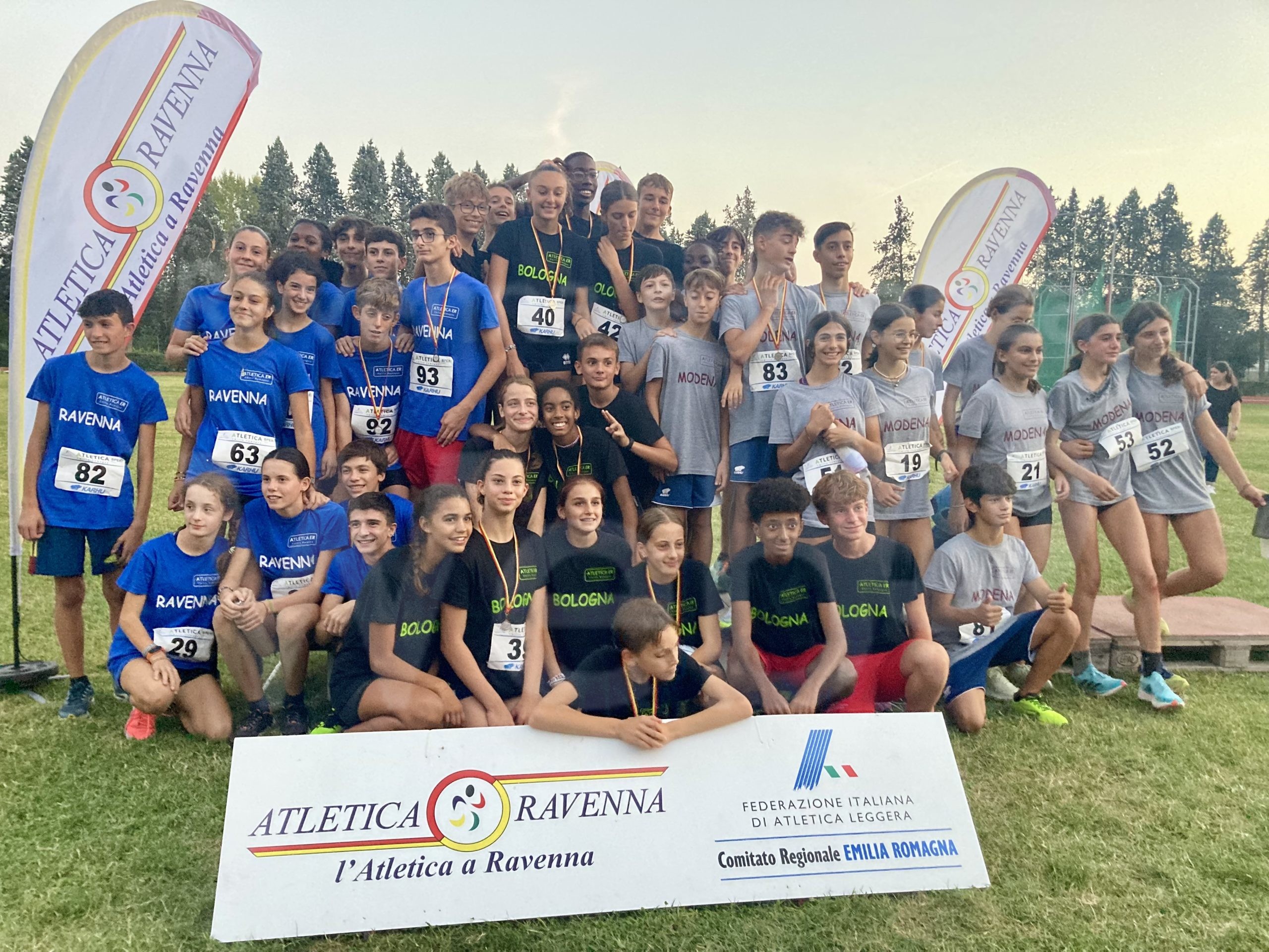 Domenica 8 ottobre si è svolta a Ravenna, al campo scuola Marfoglia, la “Fase Regionale del Trofeo Nazionale Ragazzi/e” (under 14), organizzata da Atletica Ravenna. Le rappresentative delle Province dell’Emilia Romagna si sono sfidate in una competizione di prove multiple: Tetrathlon A e Tetrathlon B, ragazzi e ragazze. La rappresentativa della Provincia di Ravenna ha ottenuto un ottimo secondo posto generale, preceduta solo da Bologna (terzo posto nella classifica Ragazze e seconda piazza per i Ragazzi). Analogamente, in tutt’Italia, si sono sfidate le altre rappresentative provinciali e, appena disponibili tutti i risultati, verrà stilata la classifica nazionale. Quattro i convocati per Atletica Ravenna: Alice Bergamini, Francesco La Cala, Leonardo Ragusi, Davide Benini. Da segnalare nel Tetrathlon B Ragazzi il 3°, 4° e 5° posto per i portacolori della Provincia di Ravenna, rispettivamente Niccolò Gaudenzi, Leonardo Ragusi e Davide Benini. Nel Tetrathlon A Ragazzi il sesto posto per Francesco La Cala, vincitore della sua batteria dei 600 m con il record personale di 1:35.69. Nonostante la caldissima giornata, prettamente estiva, sono stati registrati alcuni record regionali e diversi record personali. Soddisfazione per gli ottimi risultati degli under14 ravennati, che confermano la crescita del movimento dell’atletica leggera nella nostra Provincia!