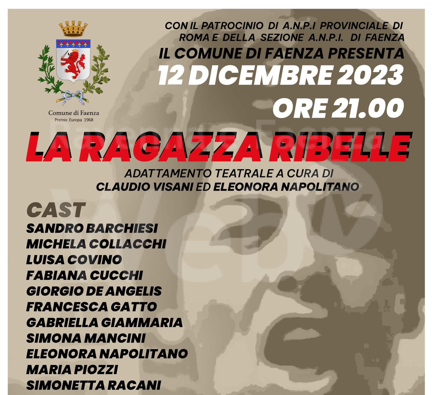 La storia della partigiana faentina Annunziata Verità, “Nunziatina”, sopravvissuta a 18 anni alla fucilazione fascista, narrata nel romanzo di Claudio Visani “La ragazza ribelle”, è ora anche una pièce teatrale. Lo spettacolo andrà in scena a Bologna, lunedì 11 dicembre alle 21 nella Sala Piazza del Centro civico Lame Borgatti in via Marco Polo 51, e martedì 12, sempre alle 21, nella Sala Teatro Fellini in Piazza Santa Maria 2 a Faenza, la città dove la protagonista, oggi 97enne, ancora vive.