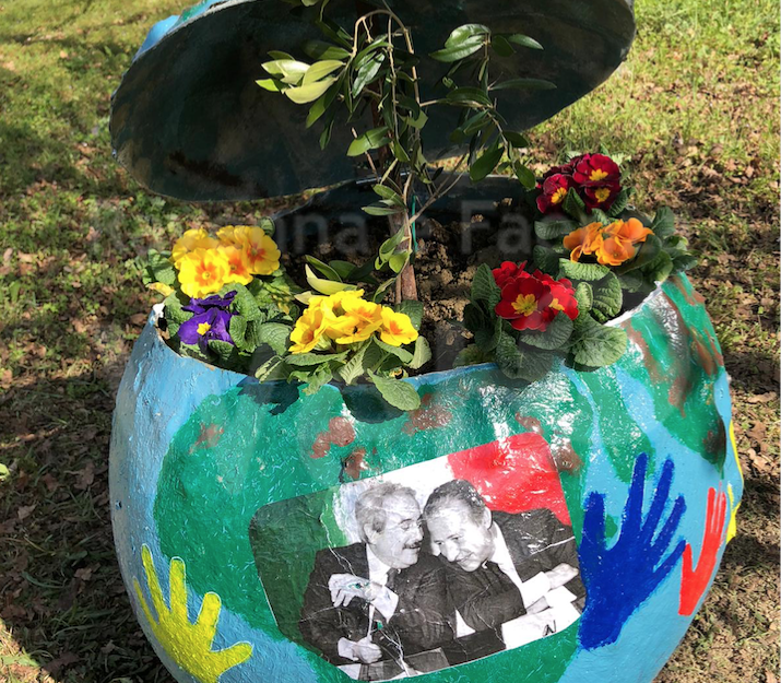 Ben visibili sull’opera artistica i volti dei giudici Falcone e Borsellino, contornati dal calco colorato delle mani dei ragazzi; la sfera in vetroresina è stata tagliata in due parti per dare inizio alla collocazione in giardino.