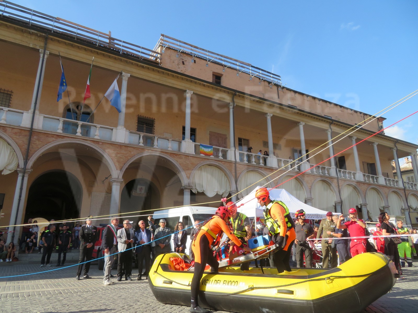 Alle 15.30, nella piazza principale della città manfreda sono stati allestiti gli stand degli Enti Locali, Croce Rossa Italiana, Esercito Italiano, Vigili del Fuoco, Carabinieri, SAR Cinofili Faenza, Romagna Soccorso 118 e Soccorso Alpino Emilia-Romagna, ANC Emilia-Romagna, Aeronautica Militare SAR 15° Stormo, Coordinamento provinciale Protezione Civile, Marina Militare-Capitaneria di Porto, Polizia Provinciale, Polizia di Stato e Guardia di Finanza. Sono stati esposti mezzi impiegati nelle emergenze mentre i Vigili del Fuoco del hanno simulato un salvataggio facendo calare dal loggiato di Palazzo del Podestà una barella con una persona trasportata sino in piazza. Dalle 16.30, nella Sala del Consiglio comunale di Faenza, alla presenza del Prefetto di Ravenna Castrese De Rosa, dell’amministrazione comunale e del comandante nazionale dei Vigili del Fuoco, Carlo Dall’Oppio, sono stati consegnati gli attestati di riconoscimento a tutte le organizzazioni che sono intervenute in soccorso alla comunità faentina durante le alluvioni di maggio 2023 e ad alcuni faentini che hanno salvato dei loro concittadini dalla furia delle acquee.