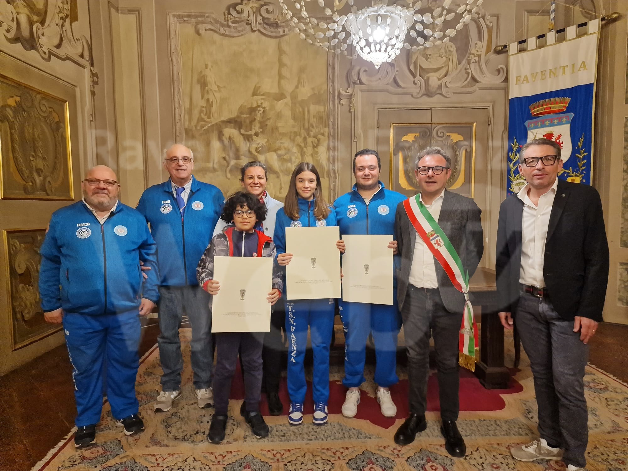 Alla luce degli ottimi risultati conseguiti dagli atleti Elisa Silvagni (13 anni), Davide Petrazzuolo (20 anni) e Ascanio Zalambani (11 anni) del Tiro a segno nazionale di Faenza, accompagnati dal presidente della sezione Francesco Fabbri e dal tecnico Fabrizio Turci, la delegazione nel pomeriggio di ieri è stata ricevuta dall’amministrazione comunale. Recentemente infatti, gli atleti Elisa Silvagni e Ascanio Zalambani, assieme a due colleghi del Tiro a segno di Rimini hanno partecipato, in rappresentanza della regione Emilia Romagna, al Trofeo nazionale Coni che si è svolto in Basilicata, una mini olimpiade che ha visto la partecipazione di circa 4500 atleti under 14 di tutte le discipline sportive, dove l’Emilia Romagna ha conquistato il terzo posto assoluto nella classifica per regioni.