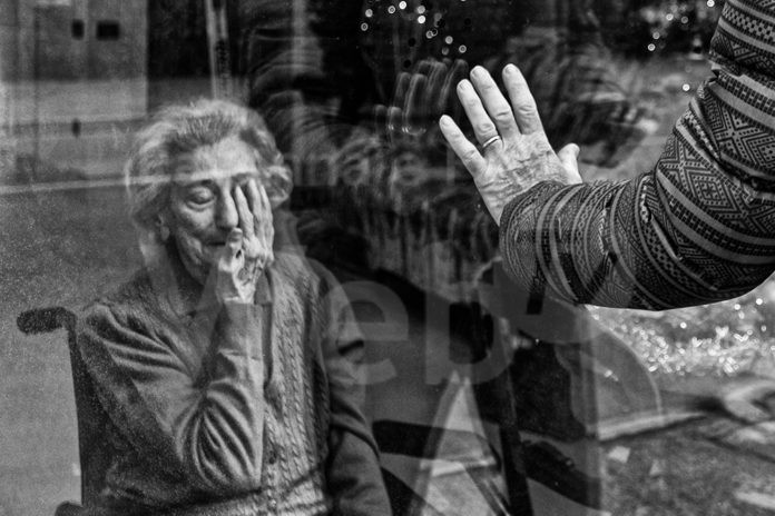 Una mano che sfiora il vetro…oltre, il volto di una donna che con il solo, semplice gesto della sua mano ci trasmette tutta la tristezza, il dolore e la speranza del momento segnato dall’emergenza epidemiologica Ciovid-19. La mano, al di la del vetro, sembra accarezzare il volto dell’’anziana segnato dall’isolamento..