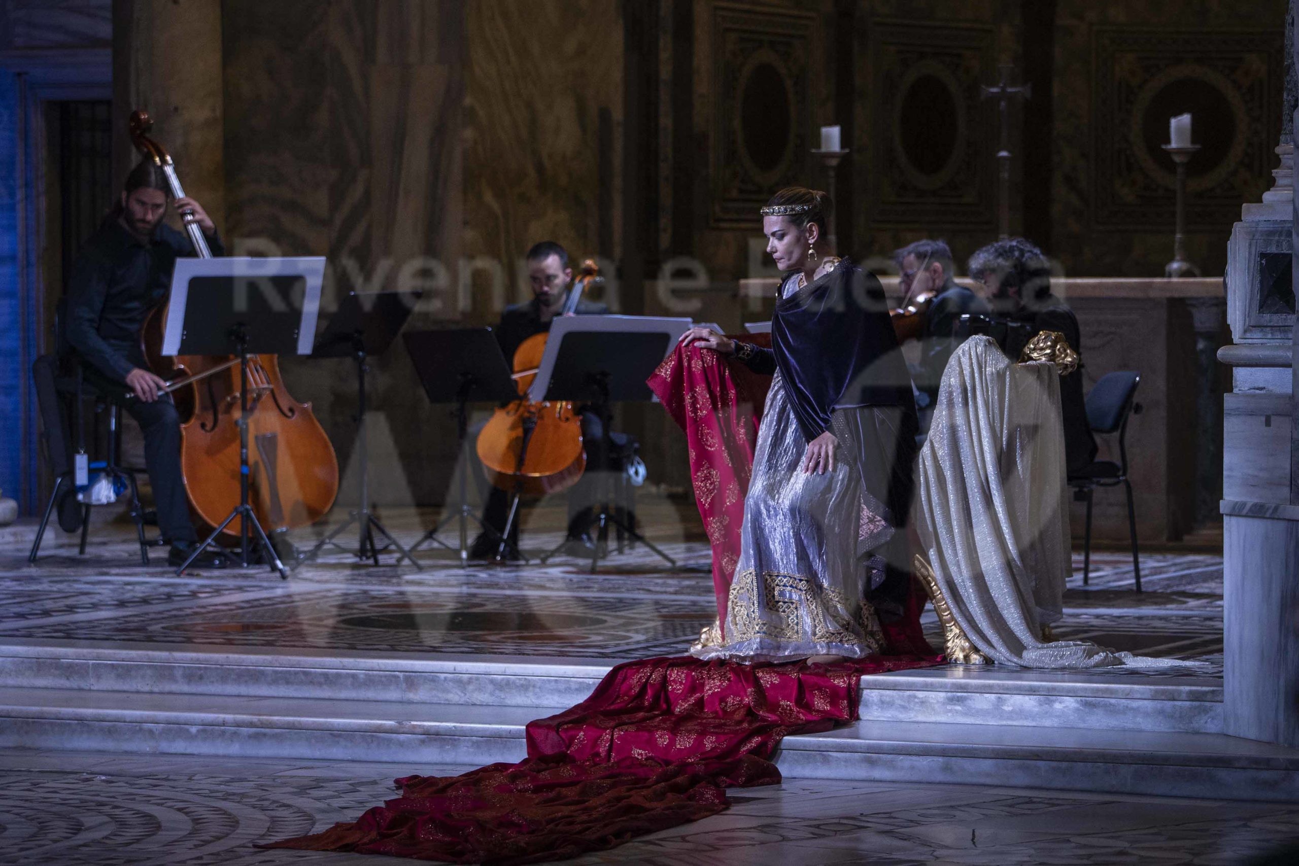 “Affrontare questa figura così complessa, mi spaventava un po’ all’inizio – racconta l’autrice del libretto e regista Barbara Roganti – e ho compreso presto che se provi a raccontare Teodora la perdi. Abbiamo cercato allora di incontrarla, non facendo di quest’opera uno strumento didattico o di inchiesta e rinunciando allo sviluppo cronologico a favore di una drammaturgia che è un labirinto e un mosaico, costruito per connessioni, riverberi, somiglianze formali. Le fonti studiate hanno lasciato un segno nel processo creativo, una parola o un colore; il linguaggio è contemporaneo ma, nella propria scarna semplicità, si fa quasi arcaico. Mi piace pensare che, come il ritratto che deve aver raggiunto l’Italia perché gli anonimi artisti fissassero il volto dell’imperatrice nell’abside di San Vitale, gesto che è fonte del tanto amore e interesse di cui Teodora gode tuttora a Ravenna, la nostra opera contenga qualche riscatto. Per esempio nel conferire a Teodora, che Procopio vorrebbe incapace sia come cantante che come attrice, la meravigliosa voce di Roberta Mameli.”