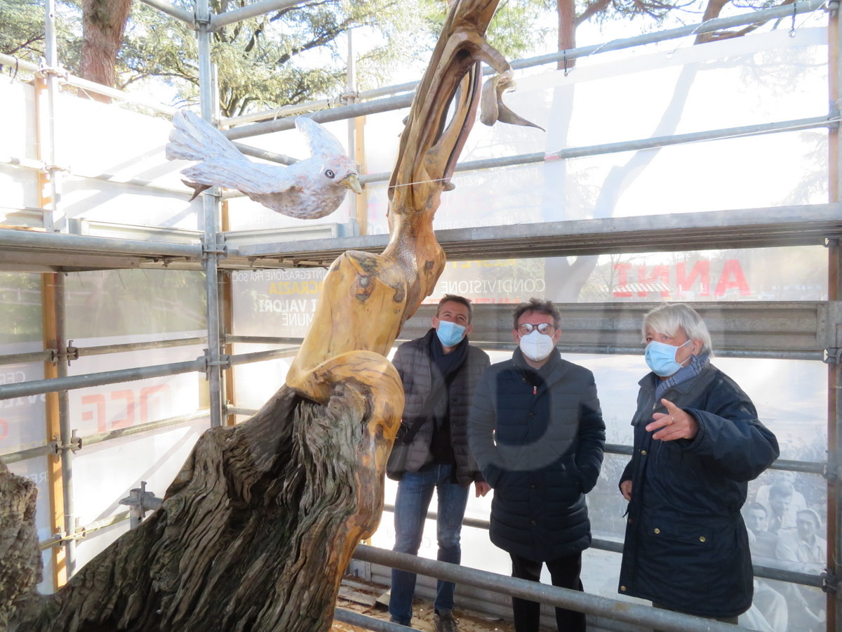 Giorgio Palli è il poliedrico artista manfredo autore di tante opere in legno ricavate da alberi abbattuti dal maltempo o grossi rami recuperati dalle potature. In città Palli è molto noto per due opere in particolare: ‘Bagno nella favola’ iconica scultura nel parco Tassinari che rappresenta la favola di Biancaneve, realizzata con il grande cedro colpito da un fulmine anni addietro e rimasto a terra per lungo tempo e per ‘Giacomino’, la simpatica figura che ‘saluta’ pedoni e ciclisti lungo la pista ciclabile per Errano, nei pressi dell’ingresso della scuola di agraria Persolino. Tra le sue opere famose c’è anche ‘EcàP’ (Pace scritta al contrario) “l’extraterrestre messaggero di pace” come l’aveva ribattezzata lo stesso artista, scultura realizzata dall’ulivo che si trovava nella rotonda ‘Strada dei vini e sapori’ a monte della circonvallazione nei pressi dell’ingresso di Villa Abbondanzi. L’albero, portato per l’inaugurazione della rotatoria in quel luogo purtroppo non si acclimatò e dopo essere seccato doveva essere espiantato. Palli si offrì di farne una scultura per la città e creò così ‘EcàP’; la realizzazione prima fece parte dell’edizione 2012 dei Giardini di Natale, in piazza del Popolo, e poi fu sistemata definitivamente all’ingresso del Parco Bucci, dove si trova tutt’ora. L’Alieno di Palli col tempo però, a contatto con gli elementi atmosferici, ha risentito di alcuni problemi e per questo è stata oggetto, da parte dello stesso artista, di un restauro conservativo. La scultura da circa tre mesi si trova avvolta da teli per celare l’impalcatura che l’amministrazione ha messo a disposizione dell’artista per poter lavorare. Palli, nel suo intervento, ha eliminare dall’intera scultura l’impregnante dato in precedenza, riportandola al legno vivo. Successivamente sono state stuccate e rinforzate le parti più deboli e infine il tutto è stato nuovamente ricoperto con un trattamento isolante per preservarlo dagli agenti atmosferici. Tra gli elementi fondamentali della scultura c’è poi una colomba che Palli ha voluto dipingere di bianco “per renderla più vicina all’idea del simbolo della pace” spiega l’artista.