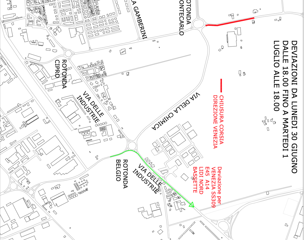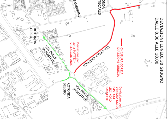 Martedì 1 luglio, sempre dalle 8,30 alle 18, resterà chiuso al traffico solo il tratto e nella direzione tra la rotonda Montecarlo e il ristorante Edo Sushi di via Romea Nord, mentre la rotonda Montecarlo sarà di nuovo percorribile. Dove saranno in corso i lavori sarà istituito il divieto di transito per tutti i veicoli (eccetto i residenti che potranno accedervi provenendo da nord); i mezzi diretti in zona Bassette o alla via Romea Nord potranno percorrere rotonda Belgio, via Baiona, rotonda dei Doganieri, via Bassette e via Di Vittorio; via della Chimica sarà aperta in entrambe le direzioni per accedere in via Mattei.