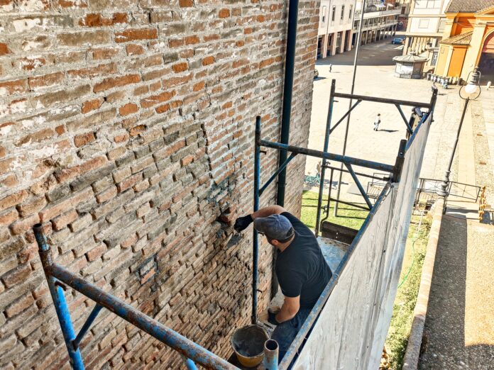 Dopo il restauro dell’angolo nord-est delle mura (largo Tricolore-Relencini) e dei parapetto della rampa di ingresso, ora è il turno della torre quadrata.