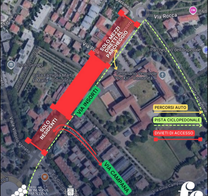 In via degli Insorti viene istituito il divieto di sosta e di circolazione veicolare (tranne velocipedi) in entrambi i sensi di marcia nel tratto tra via Campana e il civico 11 di via degli Insorti (in corrispondenza dell’accesso e dell’uscita dal parcheggio ex sede Polizia Locale, che rimarrà accessibile).