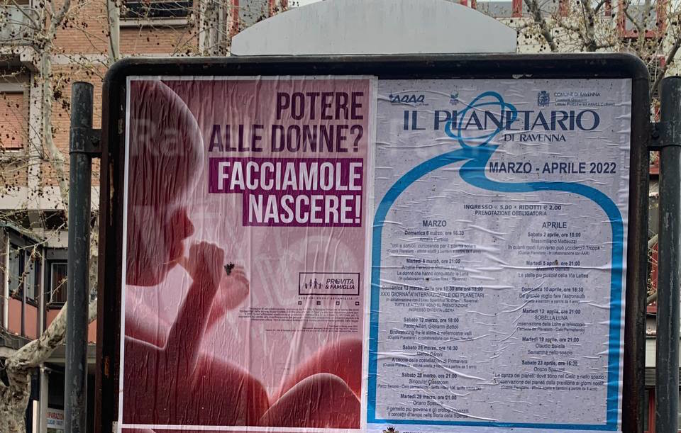 “E’ arrivata anche a Ravenna la campagna di affissioni promossa da Pro Vita & Famiglia in occasione dell’8 marzo “Potere alle donne? Facciamole nascere”.