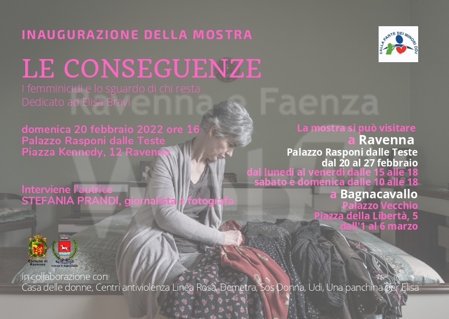 Inaugura domenica 20 febbraio alle 16.00 la mostra fotografica “Le conseguenze – I femminicidi e lo sguardo di chi resta”, allestita a Palazzo Rasponi dalle Teste, in piazza Kennedy 12 a Ravenna, con gli scatti realizzati da Stefania Prandi, scrittrice e fotografa, autrice dell’omonimo volume che raccoglie le testimonianze dei sopravvissuti ai femminicidi: figli e figlie, ma anche genitori, fratelli e sorelle, vittime secondarie della forma più estrema di violenza di genere.
