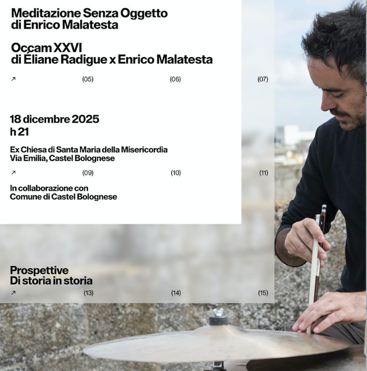 Il secondo momento della serata sarà dedicato alla ricerca sonora e performativa con il concerto per percussioni e oggetti di Enrico Malatesta, percussionista attivo sulla scena sperimentale internazionale. Il programma include la nuova produzione “Meditazione Senza Oggetto” e “Occam XXVI”, progetto nato dalla collaborazione con la compositrice francese Éliane Radigue, figura centrale della musica contemporanea internazionale e protagonista della ricerca musicale dagli anni Sessanta, pioniera delle pratiche minimaliste e dell’uso del suono continuo