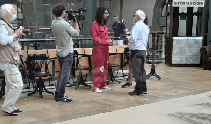 Telecamere di Mediaset oggi a Ravenna per realizzare un servizio per Studio Aperto di Italia Uno e un reportage per il magazine del canale Mediaset, previsto in onda nella programmazione autunnale. Dante e il settimo centenario della morte sono l’oggetto dei servizi, curati dal giornalista Maurizio Zuffi. La troupe di Mediaset – in collaborazione con l’amministrazione comunale e Apt servizi – ha fatto tappa al Mercato Coperto di Piazza Costa, per registrare per il TG di Italia Uno un servizio dedicato a Enrico Mazzone, l’artista impegnato al piano superiore della struttura nella realizzazione delle tre Cantiche della Divina Commedia su un foglio di carta lungo 97 metri e largo 4. L’opera, sulla quale sono già sono disegnate l’Inferno e il Purgatorio, è stata srotolata per consentire alle telecamere di riprendere in anteprima lo sviluppo delle tre Cantiche, in particolare quella del Paradiso che sarà terminata entro l’anno.