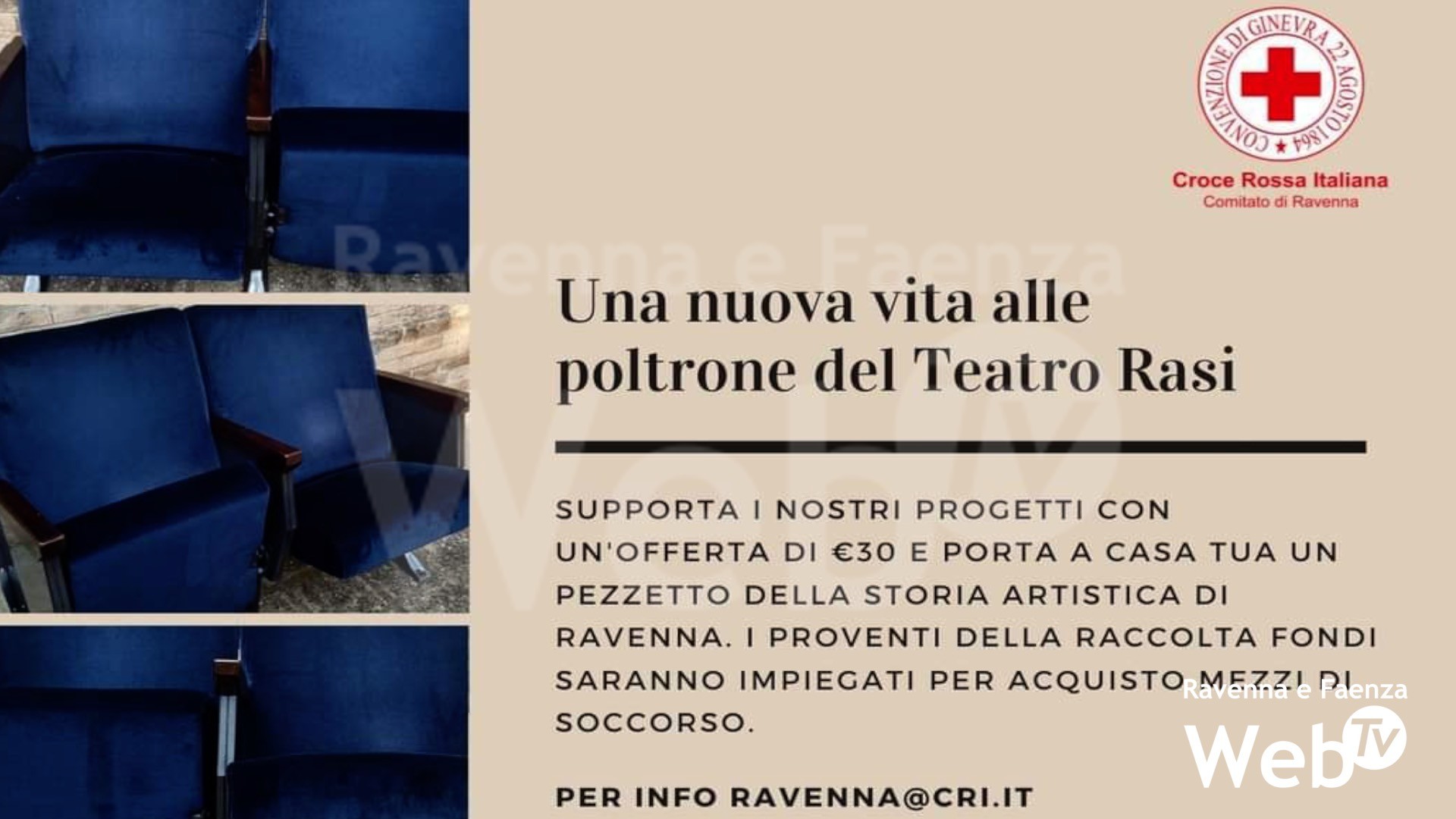 I lavori di riqualificazione del Teatro Rasi e il comitato ravennate della Croce Rossa legati. Quasi tutte le vecchie poltrone che infatti costituivano la platea del teatro sono state donate alla Croce Rossa per raccogliere fondi per l’acquisto di un nuovo natante che i volontari utilizzano durante i servizi in mare o comunque in acqua. Sono oltre 300 le poltroncine consegnate alla Croce Rossa. Con un’offerta di 30 euro all’organizzazione, chiunque può avere a casa una poltrona del teatro. Sono 230 attualmente le poltrone consegnate ai donatori. Complessivamente, grazie anche al sostegno di altri privati, la raccolta fondi ha superato la soglia dei 10 mila euro. 18 mila euro il costo del nuovo natante
