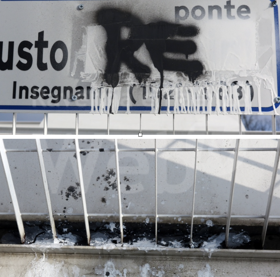 Si allegano le foto delle targhe prima e dopo lo sfregio e dettagli dell’atto vandalico.