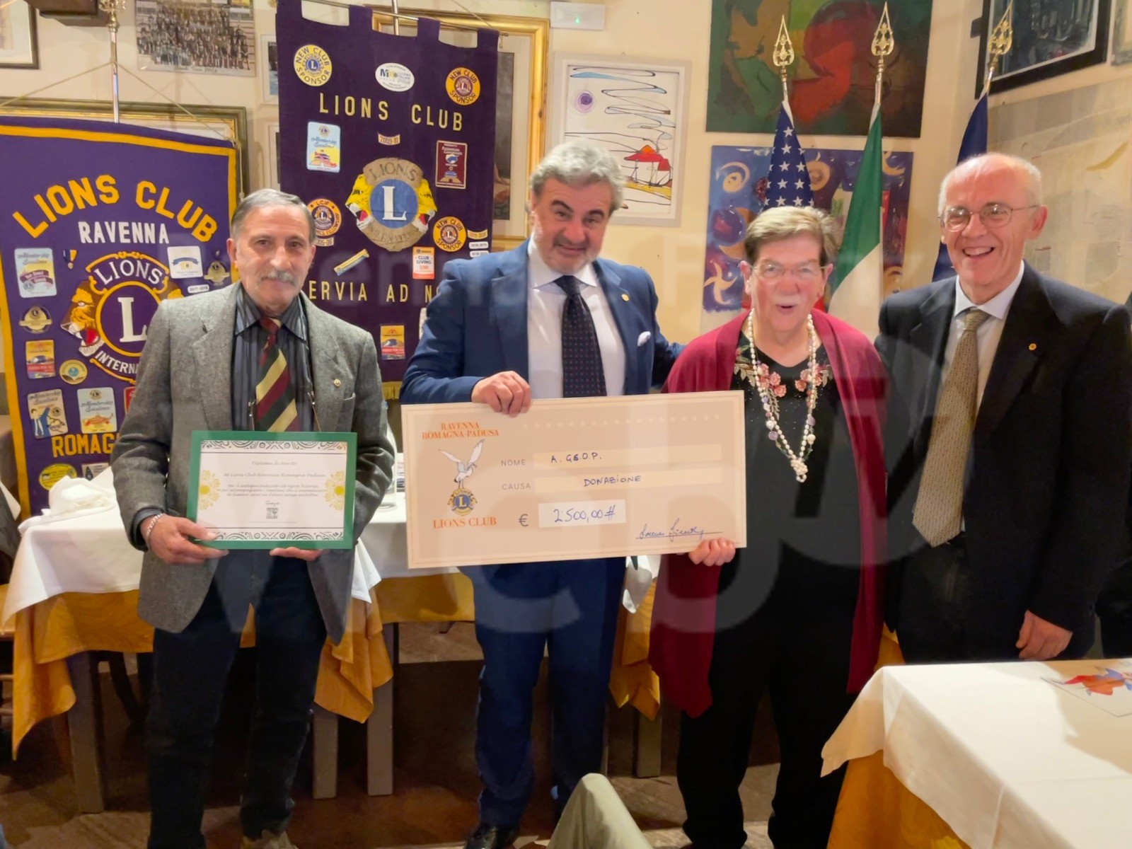 Venerdì 19 novembre i Lions Club Ravenna Romagna Padusa e Lions Club Cervia Ad Novas hanno donato all’associazione A. GE. O. P. nella persona della responsabile della sezione di Ravenna sig.ra Franca Zaganelli, quanto raccolta in occasione dell’evento Lions AutoClassic, raduno di auto d’epoca, organizzato il 25 settembre u.s. dopo un anno di stop a causa dell’epidemia di coronarivus.