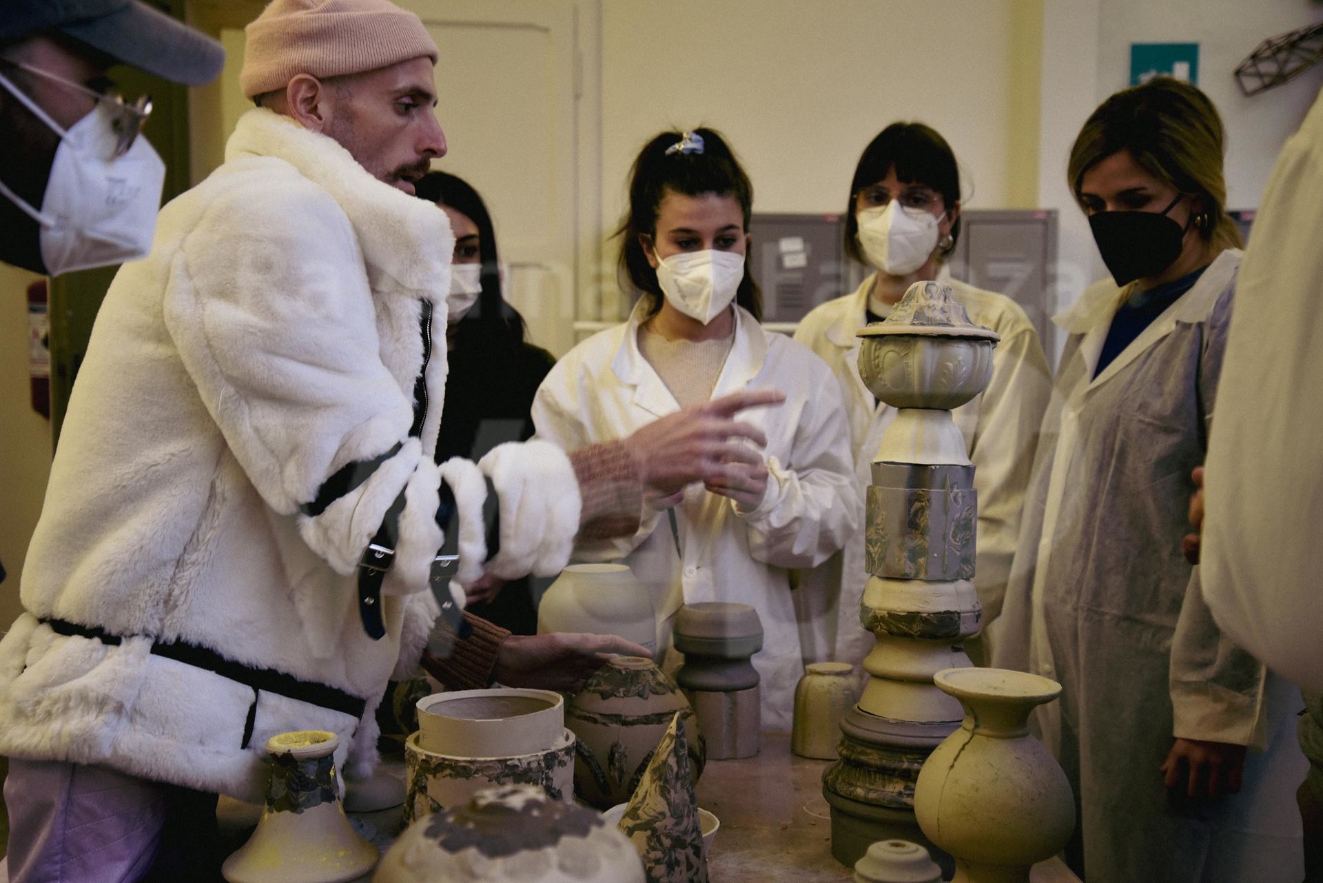Oggi più che mai, il design italiano può ripartire dalla dimensione laboratoriale, elaborando un modello autonomo di produzione basato sullo scambio ma allo stesso tempo capace di mantenere un forte legame con la sua storia. Una continuità progettuale che ha rinvigorito il processo di dialogo tra generazioni e cultura materiale, anche tramite la produzione di oggetti che inglobano esperienze stratificate producendo forme che sono come “anticorpi” in grado di evolversi e rigenerarsi nel tempo. Nel corso del workshop, grazie a una ricerca d’archivio e dal recupero di calchi e immagini provenienti dalla tradizione faentina, dalla Real Fabbrica di Capodimonte e dal suo laboratorio, Cibelli ha proposto la realizzazione di una serie di totem, modellati tramite un condiviso dialogo con gli studenti. Ogni silhouette è frutto appunto di scambio e sperimentazione, due valori propri della dimensione laboratoriale e quanto mai indispensabili per poter comprendere la società attuale e trovare un proprio posto al suo interno.