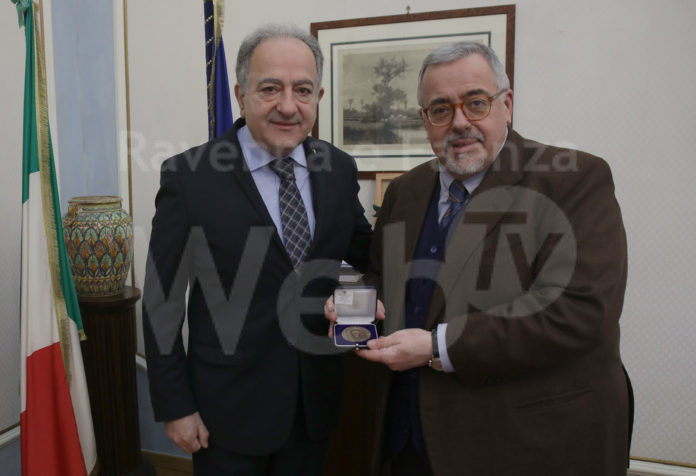 Il Presidente dell’Ordine dei Medici Chirurghi e degli Odontoiatri di Ravenna, Dr. Stefano Falcinelli, ha consegnato oggi al Prefetto Enrico Caterino la medaglia dell’Ordine raffigurante Sant’Ursicino, per ringraziarlo di quanto realizzato durante il suo mandato nella nostra città.