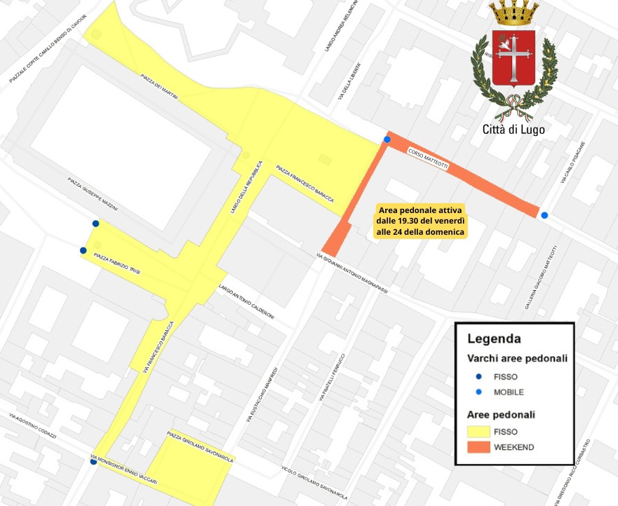 Saranno in funzione a partire da questo fine settimana, dalle ore 19.30 del venerdì alle ore 24 della domenica, i varchi per la rilevazione elettronica delle infrazioni del traffico veicolare nell’Area pedonale urbana del centro storico di Lugo (Apu). Quest’area è stata introdotta alla fine del 2022 ed è quella compresa fra il tratto finale di corso Matteotti, a partire dall’intersezione con via Pisacane, e la parte della stessa piazza Baracca che arriva fino a via Magnapassi.