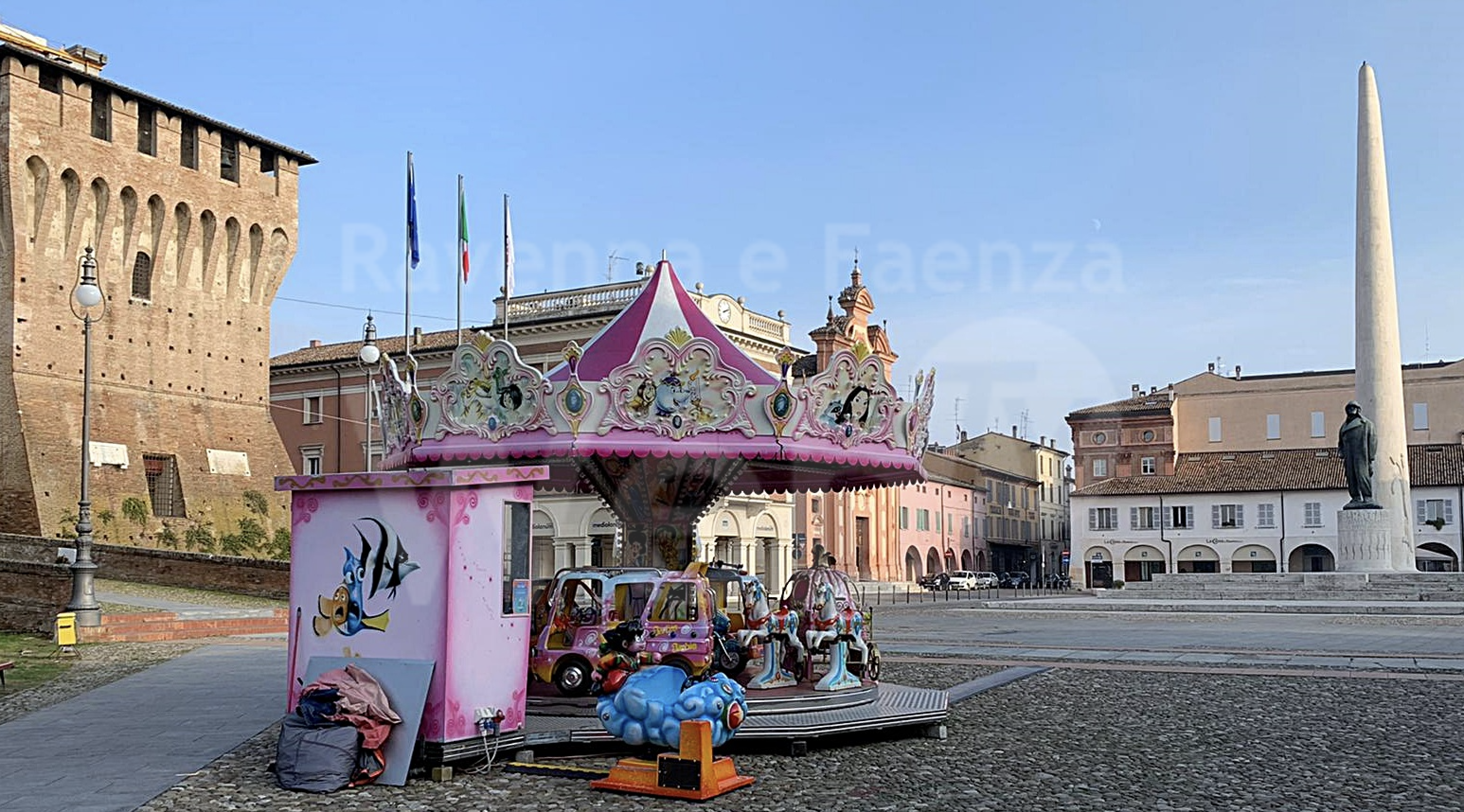 La “giostrina” di Teo Natali in piazza dei Martiri, davanti alla Rocca di Lugo, è aperta al mattino dalle 10 alle 12.30 e al pomeriggio dalle 15 alle 19.30.