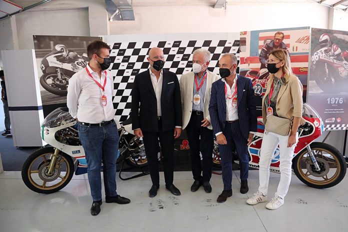 Il box n°2 dell’autodromo ha ospitato la mostra-tributo con alcune moto della Scuderia, una serie di pannelli che raccontavano la storia, i piloti e tutti i personaggi che hanno animato con la loro passione ed il loro lavoro quel periodo di grandi successi.