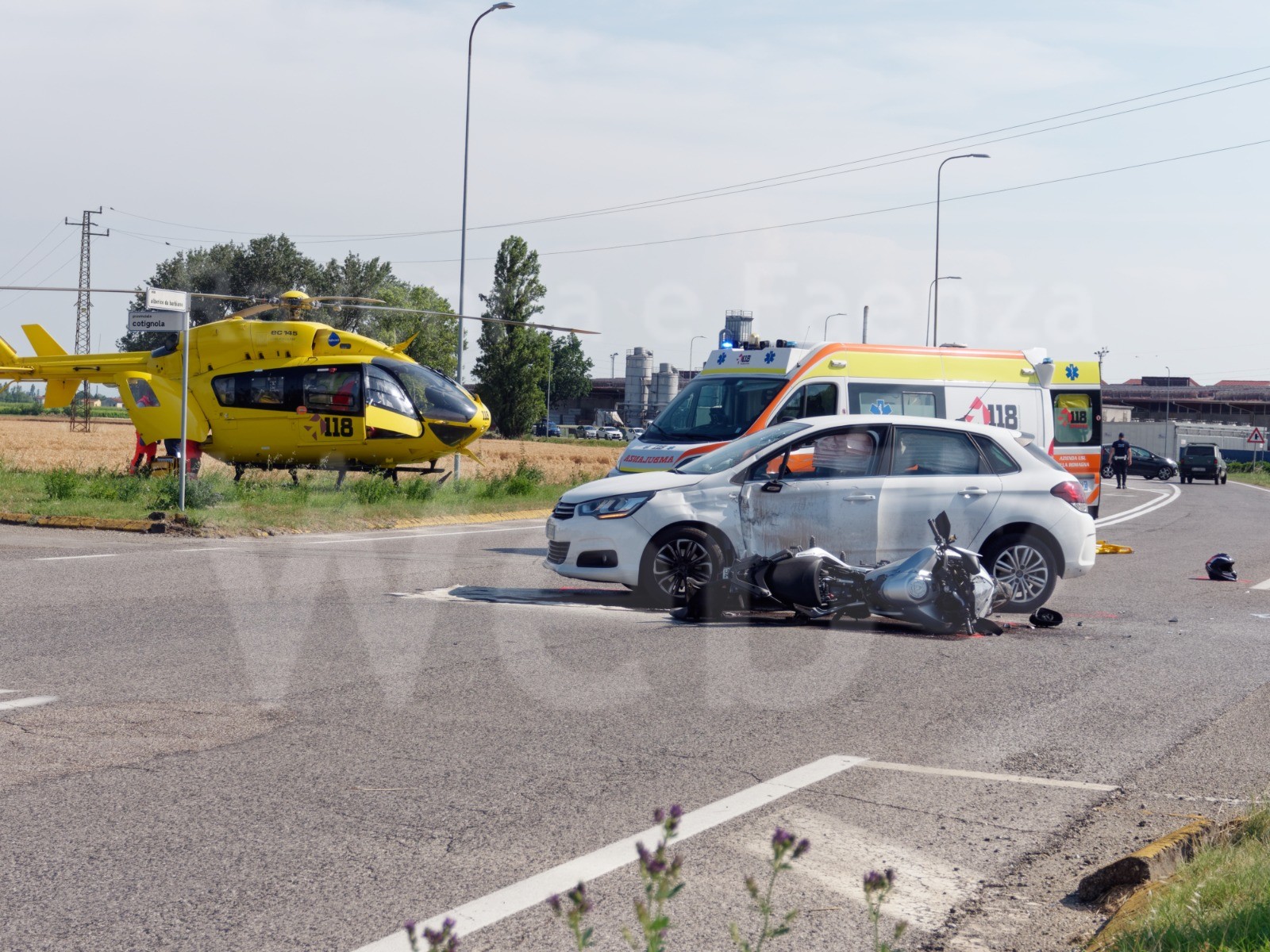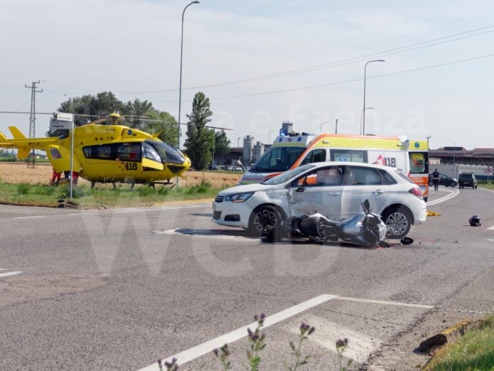 Oggi pomeriggio verso le 16,30 violento scontro tra una Citroen C4 ed una Ducati nella provinciale di Cotignola all’altezza dell’incrocio con via Alberico,da una prima ricostruzione l’auto si stava immettendo su via Alberico, mentre sopraggiungeva proveniente da Barbiano il motociclista in direzione Cotignola. Lo scontro è stato violento il motociclista è volato sull’asfalto riportando ferite di media gravità, nonostante questo il personale del 118 intervenuto ha preferito il trasporto con l’elicottero al Bufalini di Cesena. Illeso l’automobilista. Sul posto per i rilievi e per la gestione del traffico parzialmente bloccato la Polizia Locale della Bassa Romagna
