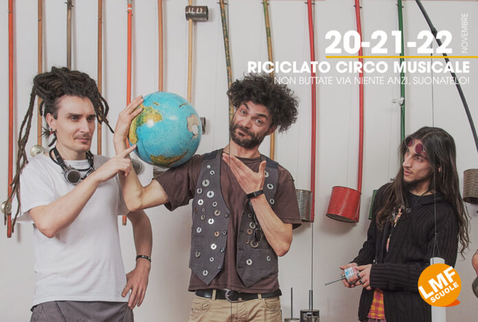 Riciclato Circo Musicale è un progetto educativo che, attraverso il recupero di oggetti di uso comune destinati al macero, insegna ai più piccoli il valore del riciclo e della sostenibilità, sviluppando allo stesso tempo le loro capacità musicali e artistiche. Durante il laboratorio, i partecipanti saranno guidati da Andrea Accoroni, musicista polistrumentista e ideatore del progetto, nella costruzione di strumenti musicali usando materiali come bottiglie di plastica, scatole di cartone, tubi e altri oggetti di recupero.