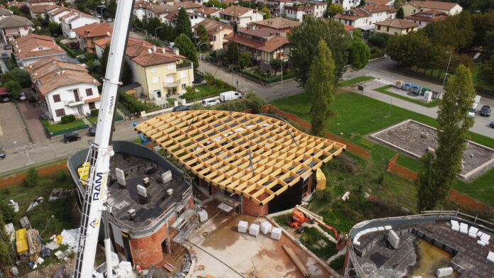 In queste settimane è stato completato l’assemblaggio a terra del solaio di copertura, elemento architettonico di rilievo del fabbricato in costruzione, che che è stato poi posato in quota; è realizzato in legno lamellare e ha un andamento curvilineo. Sono inoltre stati già completati i lavori di edificazione in muratura: a tetto posato, seguiranno l’installazione degli infissi e i lavori di finitura.