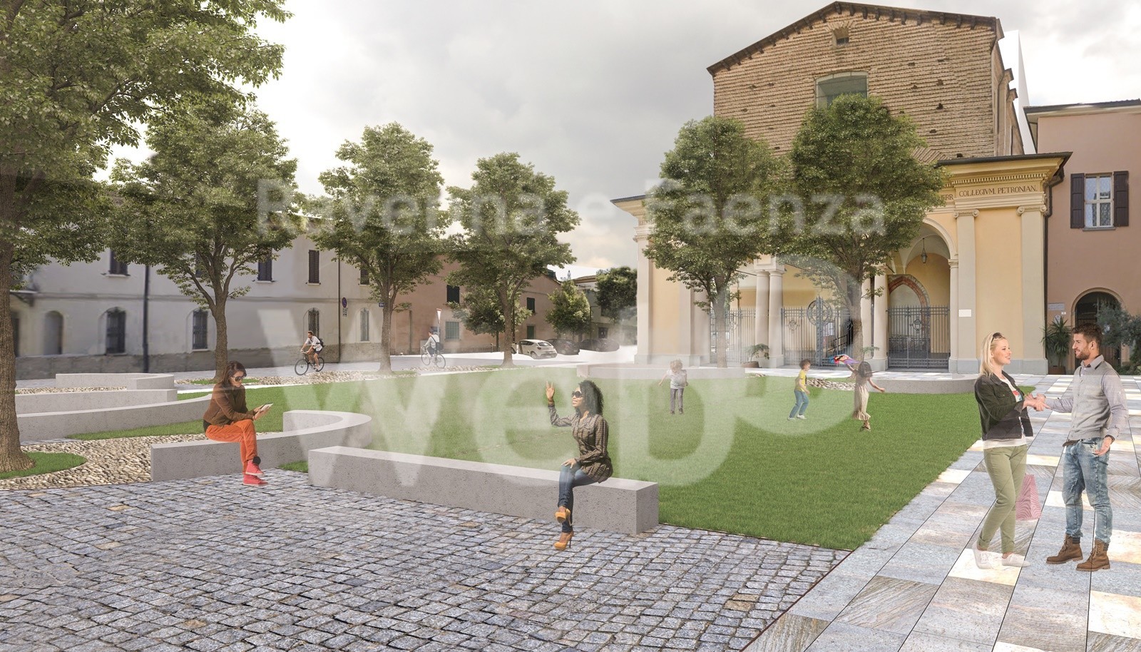 Gli alberi presenti nella piazza verranno valorizzati e attorno a ogni pianta sarà inserita un’area di protezione per garantire e salvaguardare la parte limitrofa al tronco dell’albero. Questa area di protezione sarà composta da ciottoli, recuperati dal ciottolato già esistente, disposti a forma ellittica intorno a ogni albero. La forma ellittica ricorda la proiezione a terra dell’ombra degli alberi. Tali forme generano, in alcuni casi, le sedute lungo il perimetro, creando spazi di passaggio, di sosta e di accoglimento. Il progetto prevede infatti anche la realizzazione di sedute, posizionate in modo da ottenere, per chi ne usufruirà, scenari e viste diversificate. L’approccio a garantire un comfort climatico ha spinto l’Amministrazione comunale a considerare l’acqua come elemento vitale che può, insieme al verde, caratterizzare questo luogo come spazio vivibile e generatore di vita. Il progetto prevede la realizzazione di un sistema di irrigazione degli alberi e di nebulizzatori.