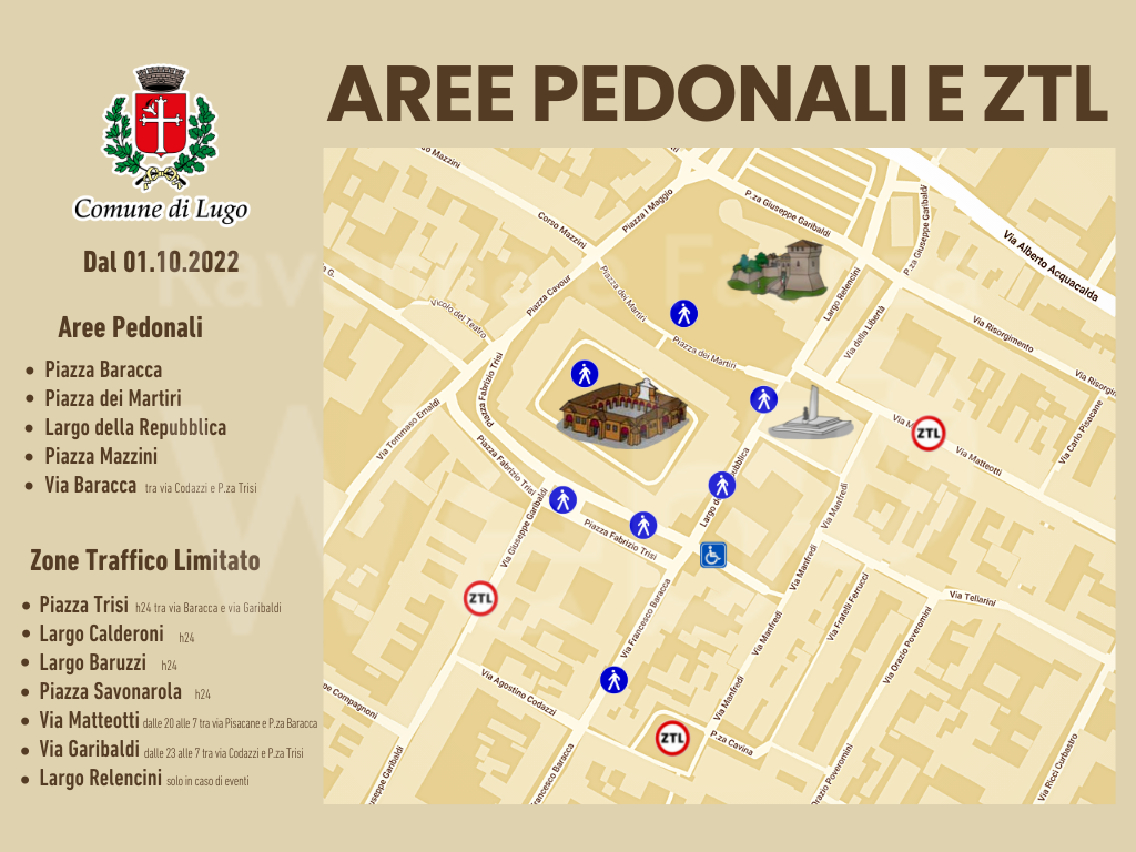 La zona a traffico limitato si amplia e diventa valida per 24 ore in piazza Trisi, nel tratto tra via Baracca e corso Garibaldi, in largo Calderoni, in largo Baruzzi e in piazza Savonarola (dove vige già); in corso Matteotti tra via Pisacane e piazza Baracca la ztl è attualmente dalle 20 alle 7 mentre in corso Garibaldi, tra via Codazzi e piazza Trisi, la ztl è dalle 23 alle 7. In largo Relencini la zona a traffico limitato sarà attivata solo in caso di eventi.