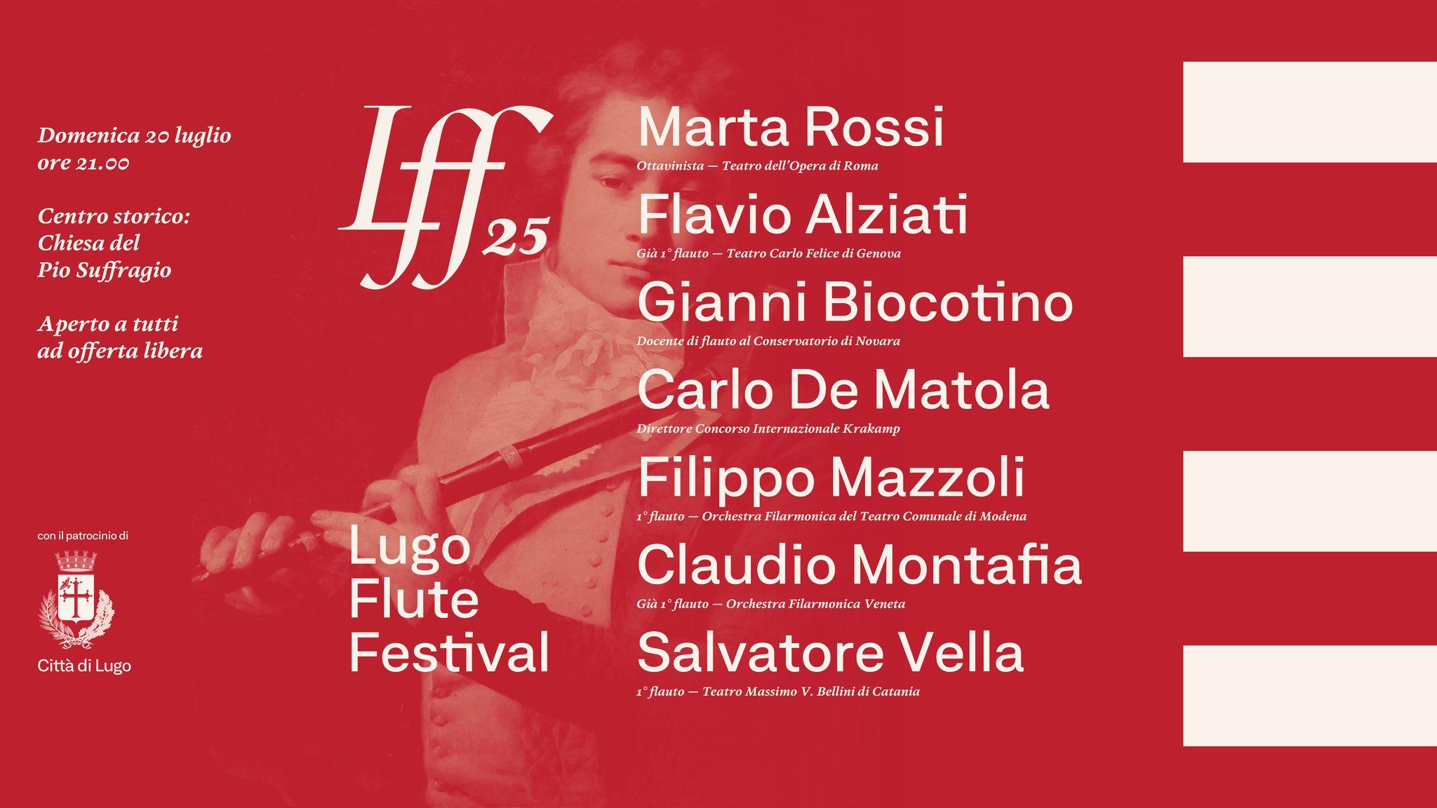 Domenica 20 alle 20.30 si partirà infatti, sotto il monumento a Francesco Baracca di Domenico Rambelli, con il concerto gratuito «Rossini fa Baracca», che coinvolgerà tutti i docenti e maestri di strumento di questa edizione in un travolgente omaggio al genio di Rossini. A seguire, alle 21 alla chiesa del Suffragio la serata proseguirà con il concerto dei maestri vero e proprio, anch’esso a ingresso gratuito. Ad aprire la serata, al pianoforte, sarà David Anthony Borisov, allievo del maestro Mauro Minguzzi, dopo il quale prenderanno posto uno dopo l’altro Marta Rossi (ottavinista del teatro dell’Opera di Roma), Flavio Alziati (già 1° flauto del teatro Carlo Felice di Genova), Gianni Biocotino (docente di Flauto al conservatorio di Novara), Carlo De Matola (direttore del concorso internazionale Krakamp), Claudio Montafia (già 1° flauto dell’orchestra Filarmonica Veneta), Filippo Mazzoli (1° flauto dell’orchestra Filarmonica del teatro Comunale di Modena) e Salvatore Vella (1° flauto del teatro Massimo V. Bellini di Catania), tutti accompagnati dalla maestra Roberta Ropa.
