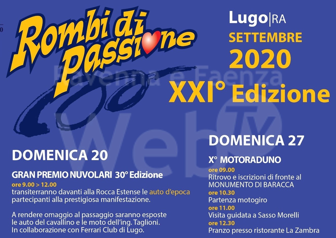 Purtroppo non si svolgeranno gli altri eventi tradizionali della manifestazione “Rombi di Passione”, iniziata nel 1999 ed organizzata dall’Associazione Una Passione in Moto, che coniuga la rievocazione della tradizione motociclistica lughese con la raccolta fondi per adozioni a distanza di bambini bisognosi, e neppure la “Festa del Cavallino”, appuntamento che il Ferrari club Lugo organizza annualmente e che grande richiamo ha sempre avuto per tutti i possessori e gli appassionati delle Auto del Cavallino. La collaborazione tra le due associazioni rappresenta bene l’impegno dei volontari che vogliono offrire alla propria città occasioni per ricordare le tradizioni locali e per richiamare a Lugo appassionati dai dintorni e non solo.