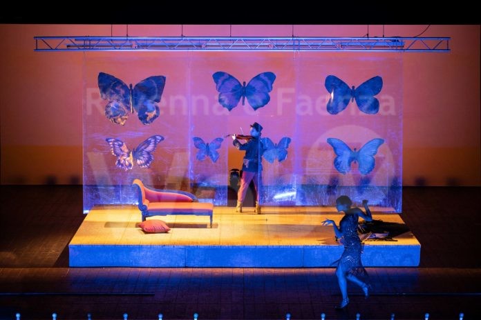 Una storia da raccontare, suonare, danzare; una fiaba popolare su cui si innesta uno dei grandi miti della modernità; un’opera d’arte concepita per essere itinerante e che è a propria volta un viaggio fra ispirazioni musicali le più disparate: sono solo alcuni dei volti della multiforme, inesausta ricchezza di Histoire du soldat, spettacolo-gioiello creato da Stravinskij poco più di un secolo fa. E che quest’anno è in scena al Teatro Alighieri: alle prove di questi giorni seguirà la trasmissione di sabato 23 gennaio, alle 18 su ravennafestival.live, dove rimarrà disponibile on demand. Il nuovo appuntamento in streaming gratuito segna la ripartenza delle attività del Teatro nel nuovo anno e celebra l’apertura della Stagione d’Opera e Danza 2020/21 con una dedica al compositore russo in occasione del 50° anniversario della morte. Con la regia di Luca Micheletti e direzione e concertazione di Angelo Bolciaghi alla guida di sette strumentisti, la produzione in lingua italiana della Compagnia teatrale I Guitti e CamerOperEnsemble vede impegnati in scena altri quattro interpreti oltre allo stesso Micheletti. Mentre quest’ultimo veste i panni del diavolo, il soldato è Massimo Scola, il narratore Valter Schiavone e la principessa Lidia Carew; le scene danzate del diavolo sono affidate invece ad Andrea Bou Othmane. La Stagione Opera e Danza è resa possibile dal sostegno del Comune di Ravenna, della Regione Emilia Romagna e del Ministero per i beni e le attività culturali, con il contributo della Fondazione del Monte di Bologna e Ravenna.