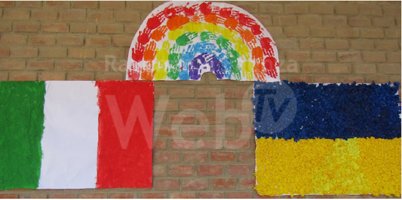 Tramite l’utilizzo di diverse tecniche pittoriche, i bambini hanno poi realizzato le bandiere dell’Ucraina e dell’Italia unite da un grande arcobaleno di mani a simboleggiare un ponte di fraternità tra le due nazioni.
