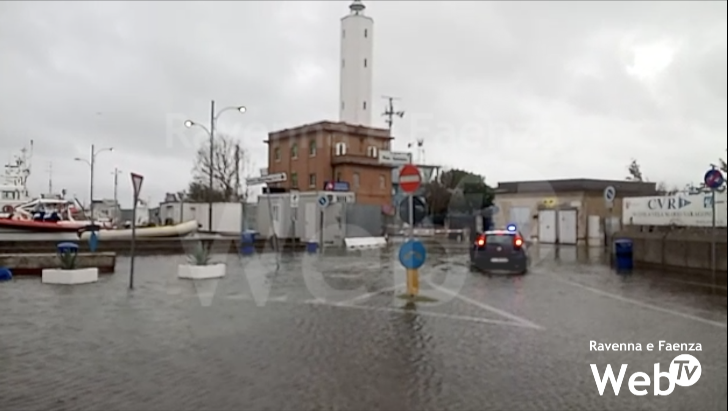 Per quanto riguarda Marina di Ravenna si sono verificati allagamenti per effetto di moto ondoso e alta marea lungo la via Molo Dalmazia e si è provveduto all’invio di squadre di volontari e camion con sacchi di sabbia da collocare in particolare nella rampa di accesso del traghetto, di cui è stato sospeso il servizio per motivi precauzionali.