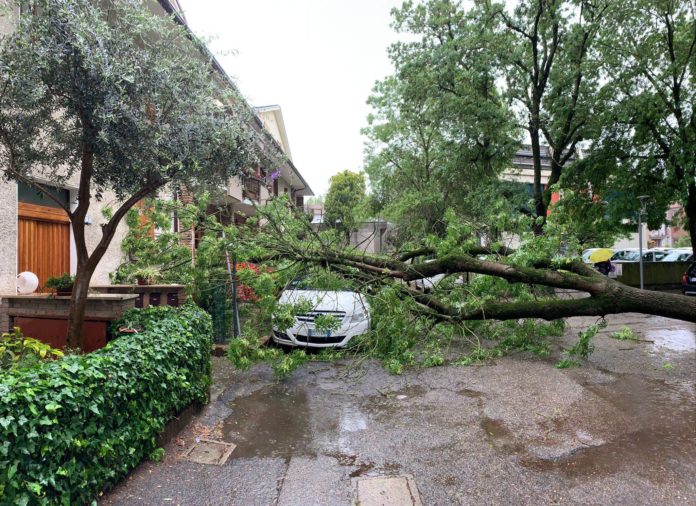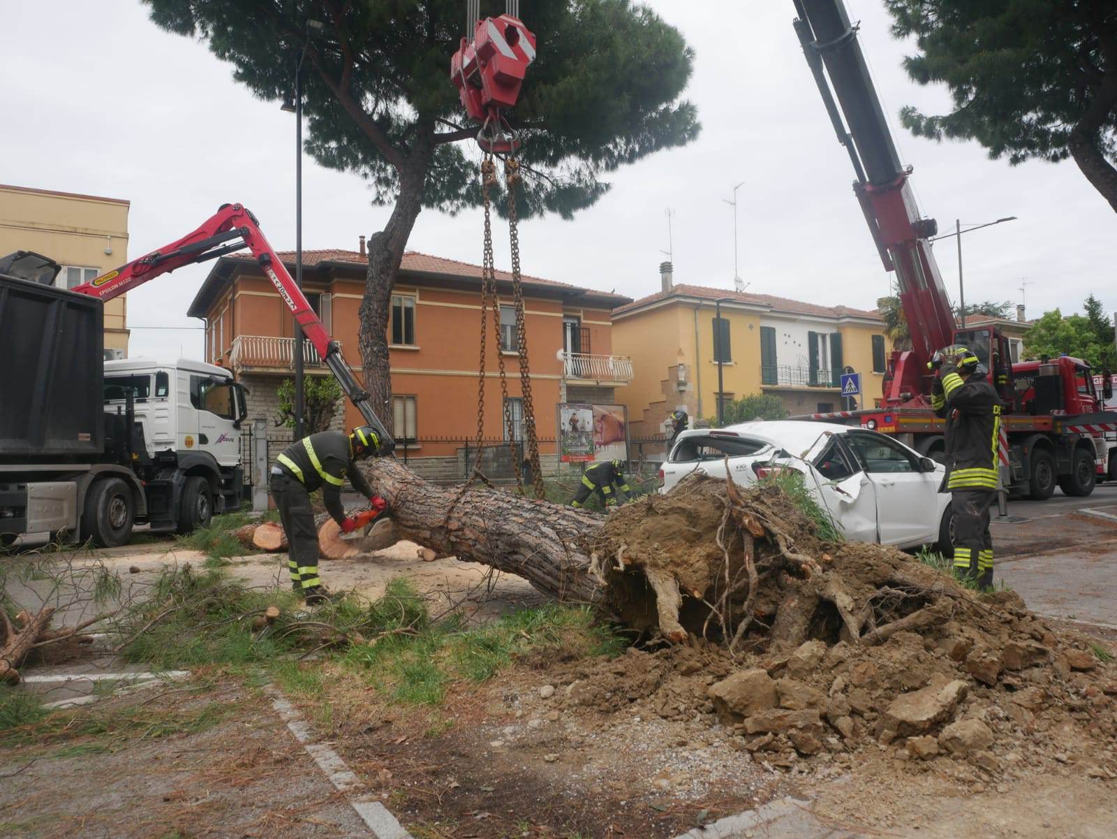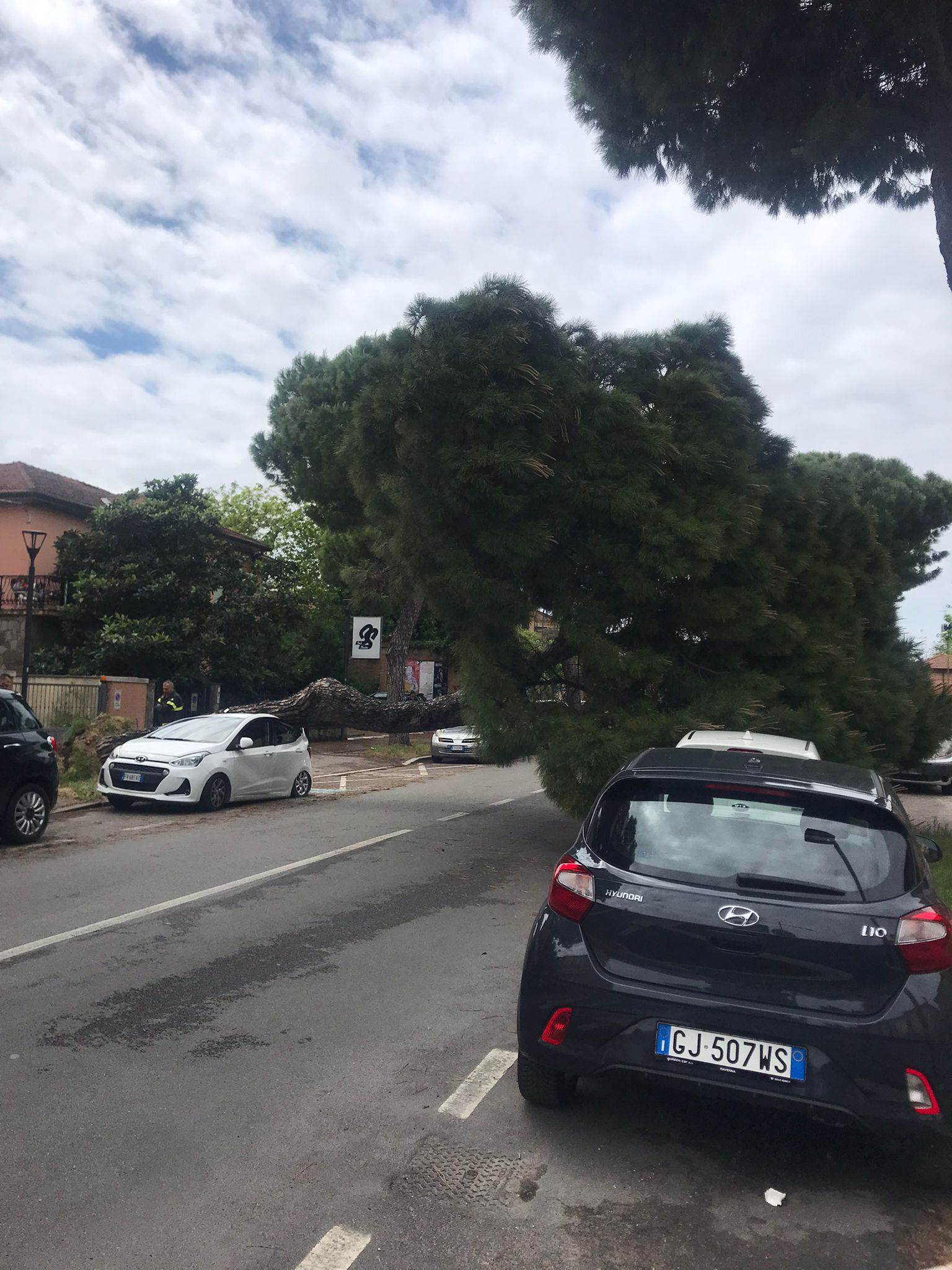 Un grande pino è crollato in mezzo alla strada in Via Renato Serra a Ravenna, distruggendo completamente un’autovettura parcheggiata e inoltre ha colpito un furgoncino parcheggiato sul lato opposto della strada.