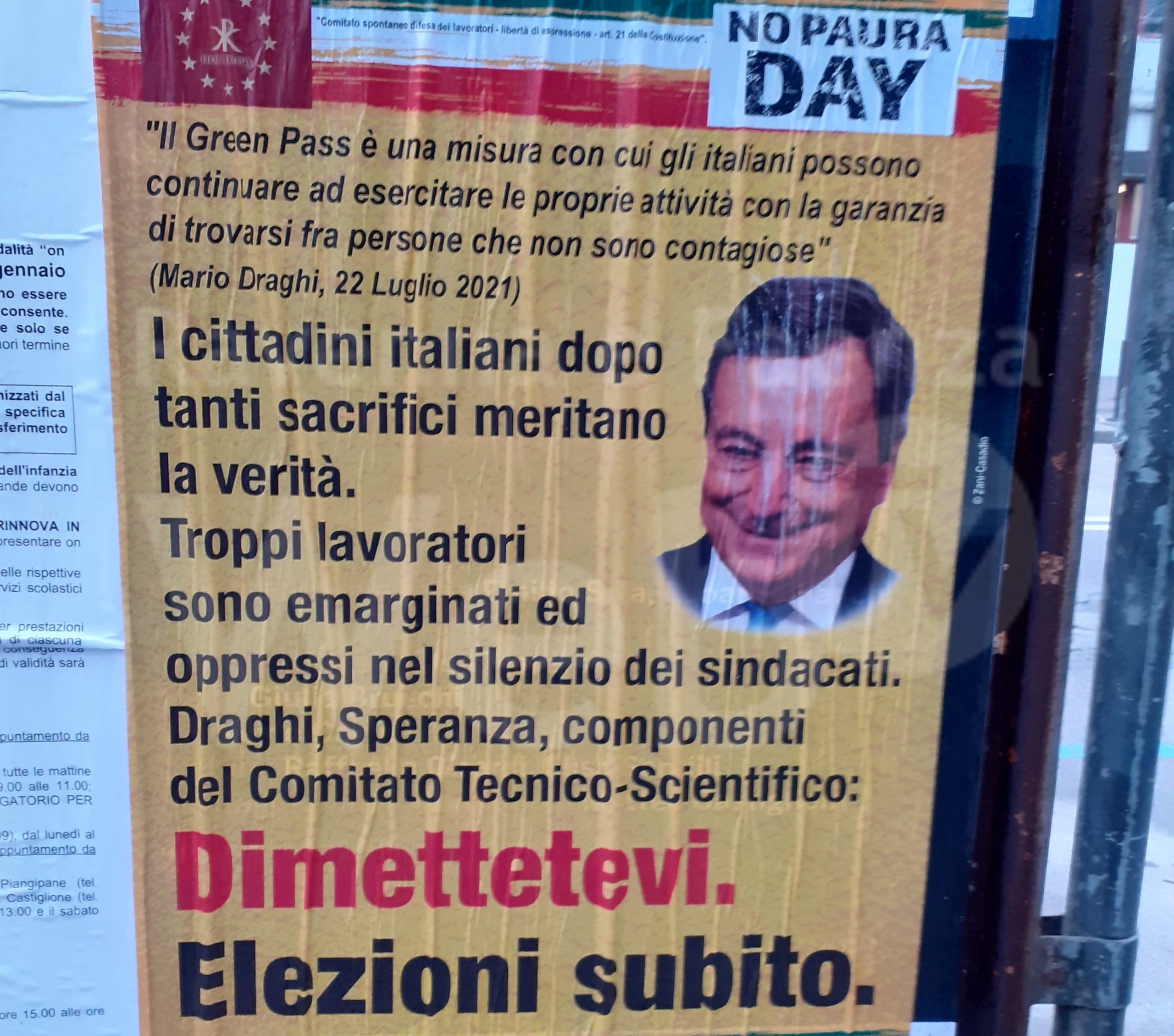 Sono stati affissi oggi a Ravenna e Rimini manifesti per chiedere le dimissioni del presidente del Consiglio Mario Draghi, del ministro della Salute Roberto Speranza e del Comitato Tecnico Scientifico, in solidarietà ai lavoratori sospesi a causa della loro obiezione alla vaccinazione obbligatoria.