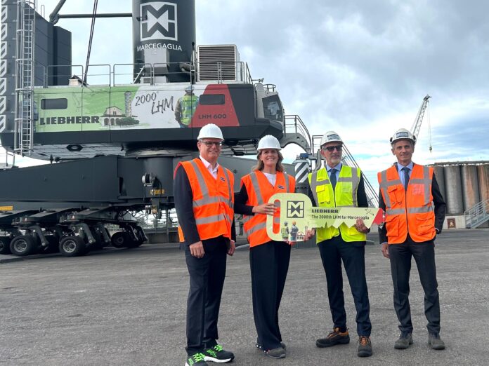 Con questa nuova gru, la sesta consegnata da Liebherr nel corso degli anni, Marcegaglia Ravenna porta a 5 la sua flotta attiva a supporto delle attività di banchina, scarico e carico coils, a testimonianza di una partnership consolidata da decenni e segnata da una coincidenza storica: l’unità collocata a Ravenna è la numero 2.000 della serie di gru portuali mobili prodotte dal gruppo tedesco. Un traguardo importante che si è deciso di celebrare ufficialmente, proprio nello stabilimento ravennate, alla presenza dei vertici delle due aziende (e famiglie imprenditoriali): Antonio Marcegaglia, presidente e CEO di Marcegaglia Steel, che insieme alla sorella Emma guida l’omonima azienda di famiglia; Patricia Rüf, terza generazione della famiglia Liebherr e membro del consiglio di amministrazione della holding Liebherr-International AG e Leopold Berthold, amministratore delegato di Liebherr-MCCtec GmbH.