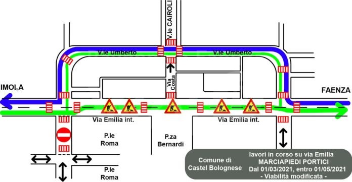 I veicoli provenienti da Faenza e diretti a Imola saranno deviati in viale Umberto I in prossimità del primo semaforo; rientreranno sulla via Emilia nel tratto successivo ai portici, al terzo semaforo (all’altezza del Museo Civico).