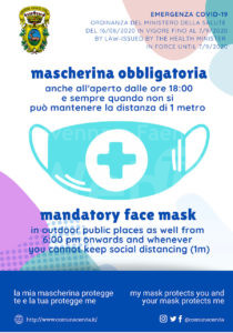 “I numeri del contagio in Italia, anche se tra i più bassi in Europa, sono in crescita. Non possiamo vanificare i sacrifici fatti nei mesi passati. La nostra priorità deve essere riaprire le scuole a settembre in piena sicurezza.” Ha dichiarato il Ministro Roberto Speranza a seguito della firma della nuova ordinanza. Per questo il Comune di Cervia ha pensato di mettere in campo tempestivamente una nuova campagna di comunicazione, riferita in particolare modo all’utilizzo della mascherina con una cartellonistica creata ad hoc. Nel nostro Comune come in tutta Italia è obbligatorio l’utilizzo della mascherina nei luoghi ove sono possibili assembramenti, sopratutto la sera come: Borgomarina, centro di Cervia, centro Commerciale di Pinarella, Centro di Milano Marittima e Oasi. È obbligatorio l’uso della mascherina nei mercati e mercatini serali, oltre che sulla spiaggia, in caso vi siano eventi o apertivi dopo le 18.00. Ricordiamo che la mascherina è e resta obbligatoria comunque a qualsiasi orario ove non si riesca a rispettare le distanze di sicurezza.